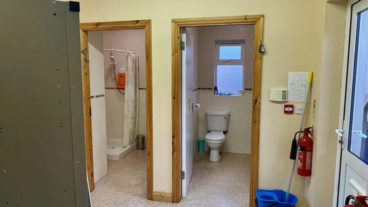 Staff Toilet / Shower room 2.01m x 1.96m with linoleum flooring, ceramic wall & floor tiles, electric shower, whb & w/c
