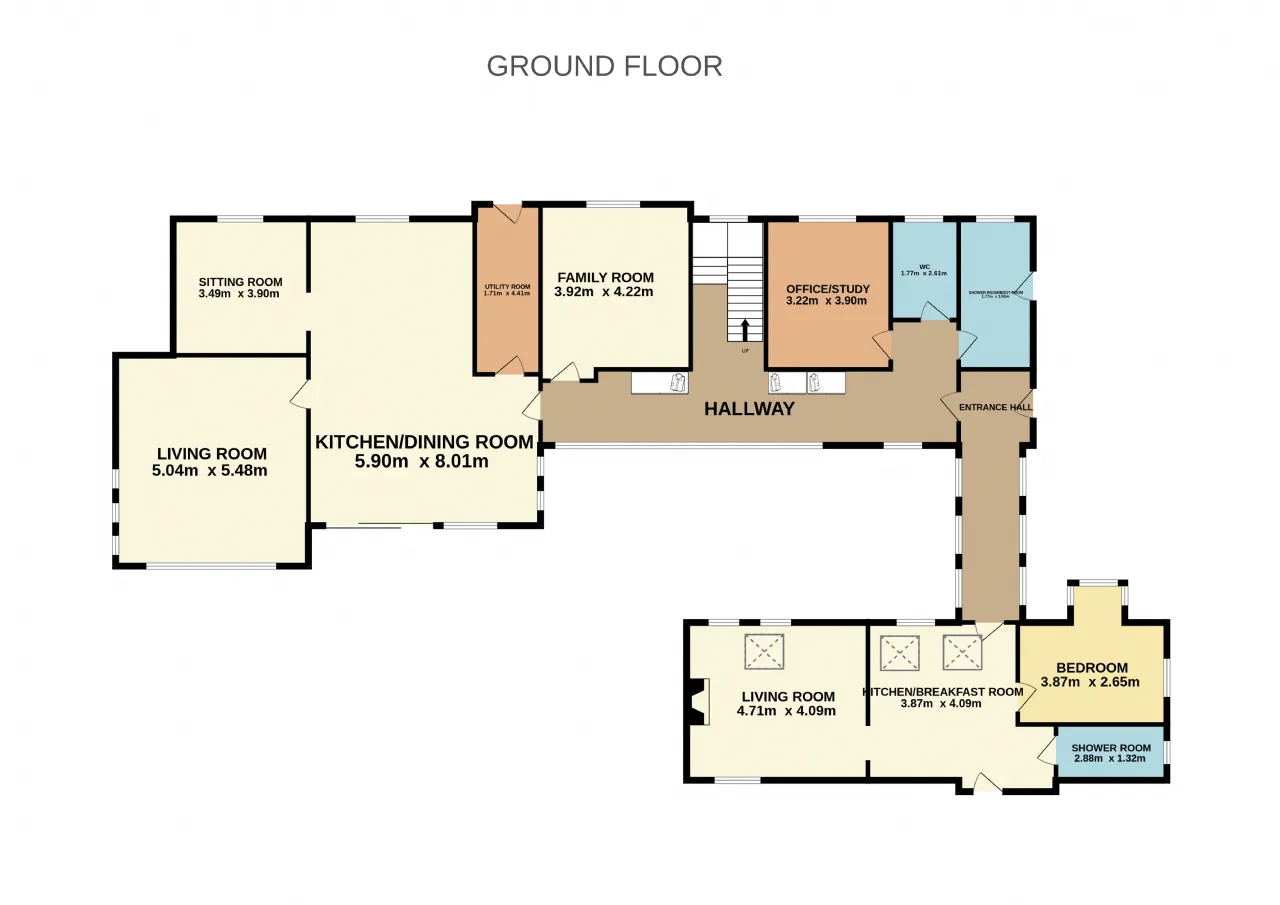 Entrance hall, guest WC, shower room/boot room, office/study, family room, kitchen/dining room, utility/laundry room, sitting room, living room, principal bedroom suite with ensuite and walk in wardrobe, three further double bedrooms with ensuite and two walk in wardrobes.
