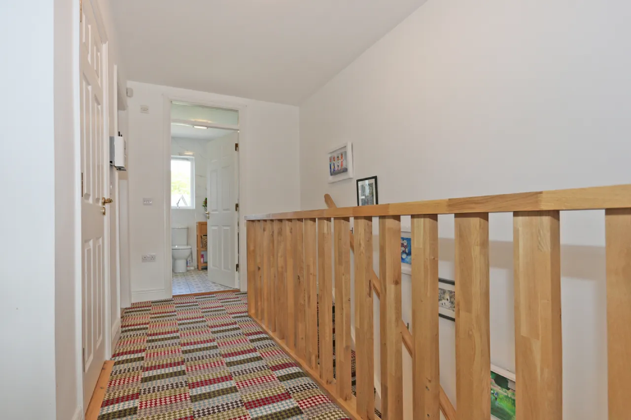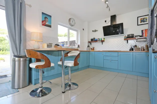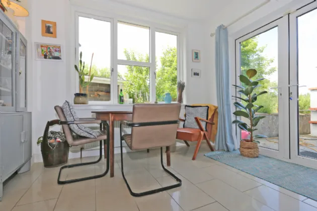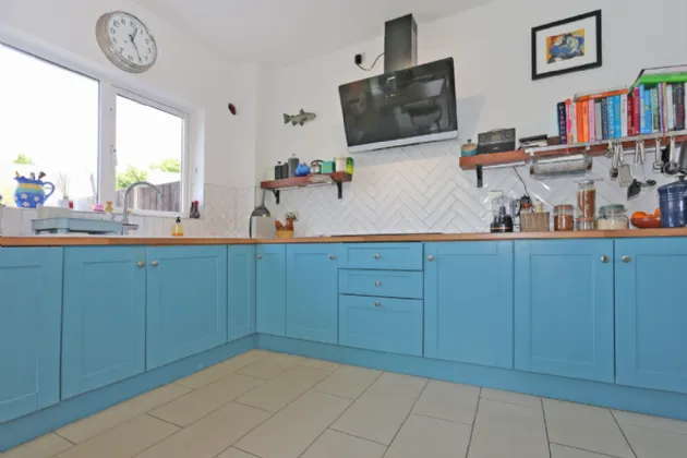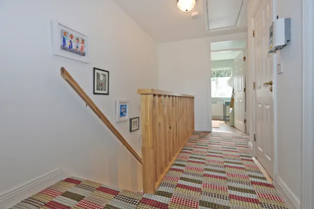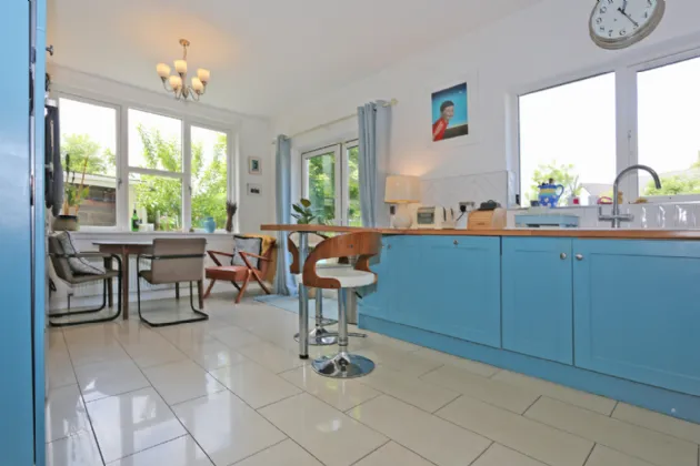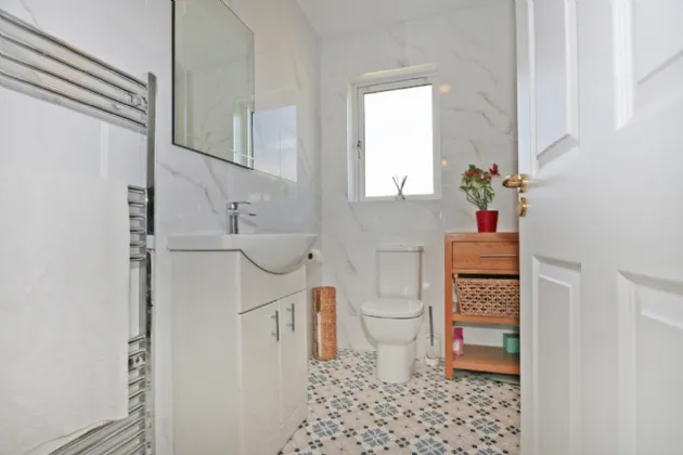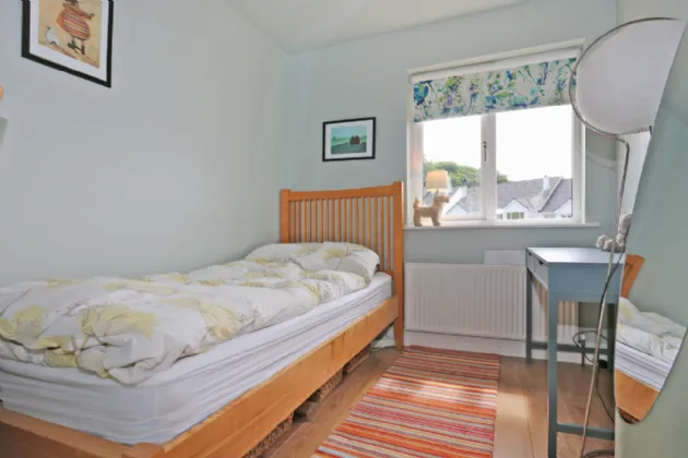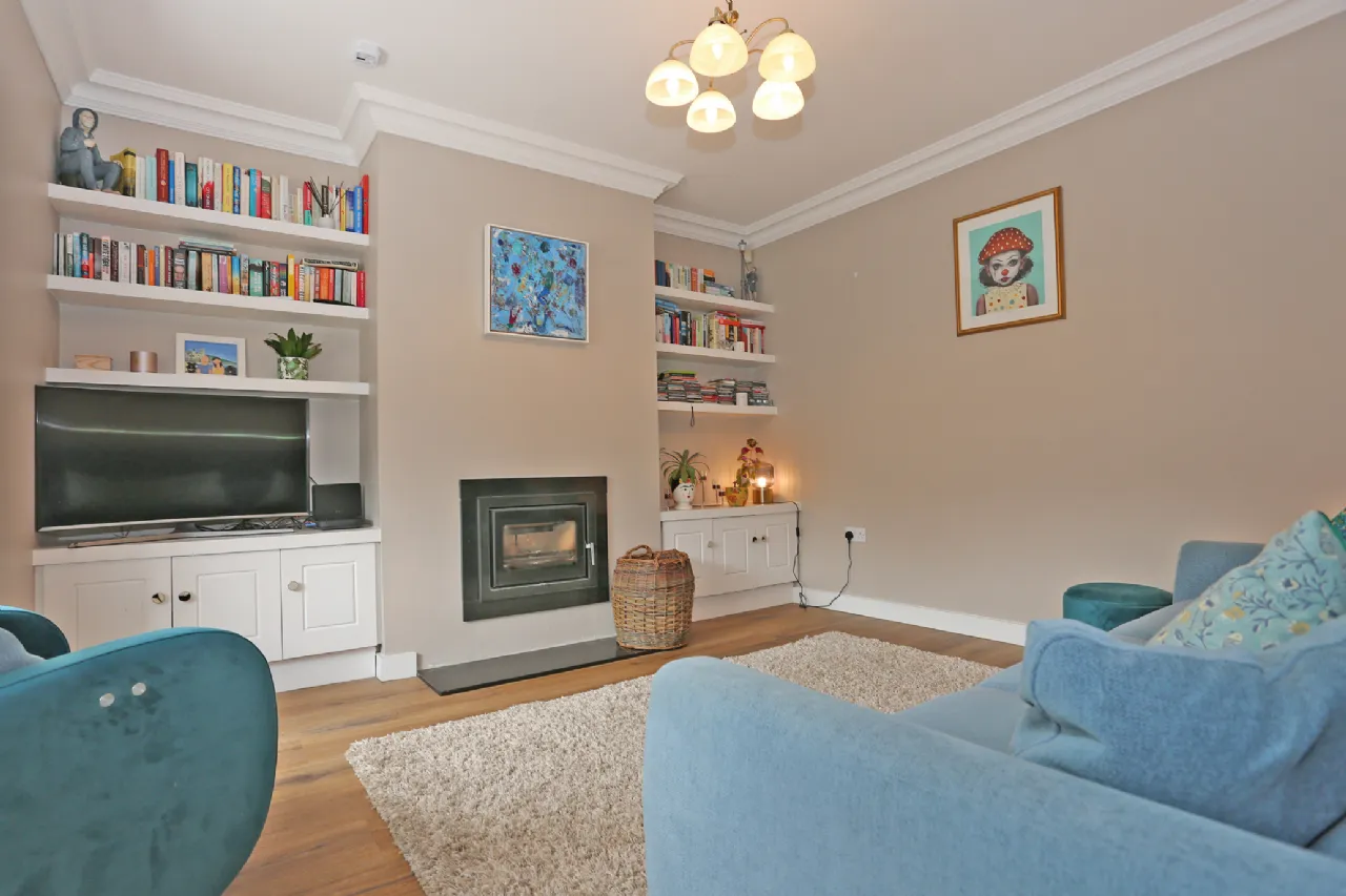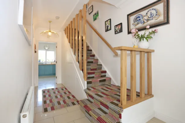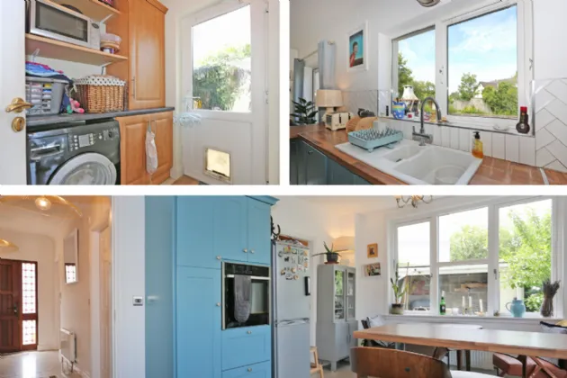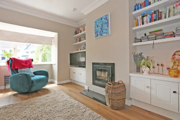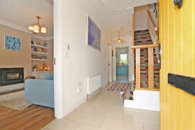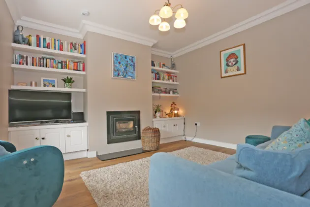 On entering the hall door you are greeted by a bright, wide entrance hall which sets the tone for the rest of the house. The quality finishes are immediately evident with oak spindles on the stairs and the living room on the left with fitted shelving and cabinetry in the recesses. The wood burning stove in the living room provides a focal point, while the feature bay window offers ample seating space. There is a downstairs WC off the hallway and the kitchen/dining room has a large side window which allows natural light to flood in, whilst there are double doors to the garden at the rear. The utility room has side access to the garden and separates the laundry from the kitchen, allowing the kitchen to be used as a perfect space for entertaining, cooking and simply relaxing with the view across the garden. Upstairs are three bedrooms, with an ensuite shower room from the main bedroom and a generous family shower room, both of which are recently refurbished.