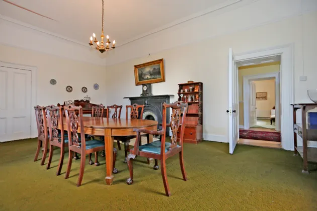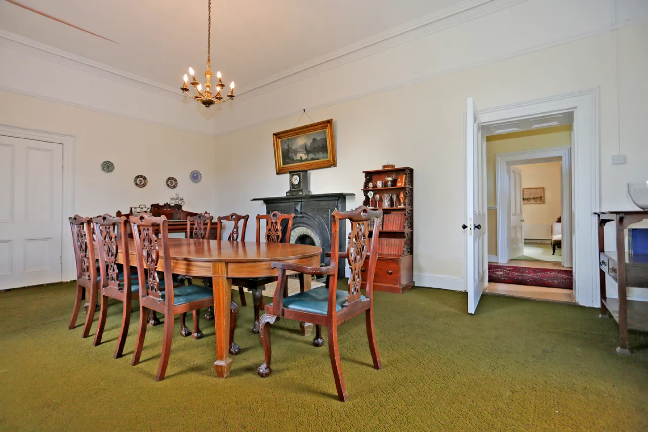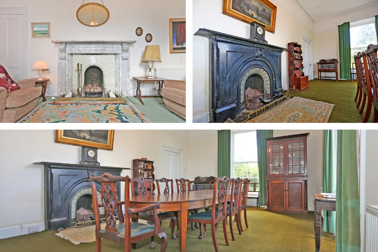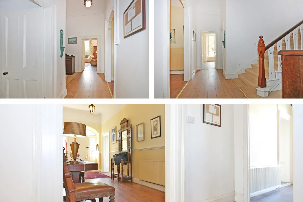 The property is approached via a sweeping driveway and upon entering there is a large reception hallway which opens into a drawing room on the right with original marble fireplace and sash windows overlooking front and double doors to garden. To the left there is the original dining room again with original fireplace intact and dual aspect windows allowing plenty of natural light through. A third reception room at hall level is a cozy room with fireplace ideal for use as a family sitting room. There is a large airy kitchen/breakfast room and a further reception room and utility room and shower room to the rear.