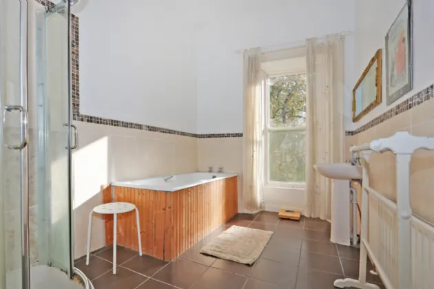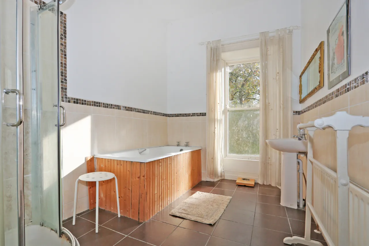 Bathroom With part tiled walls, shower cubicle with electric shower, pannelled bath, pedistal WHB, sash window with shutters