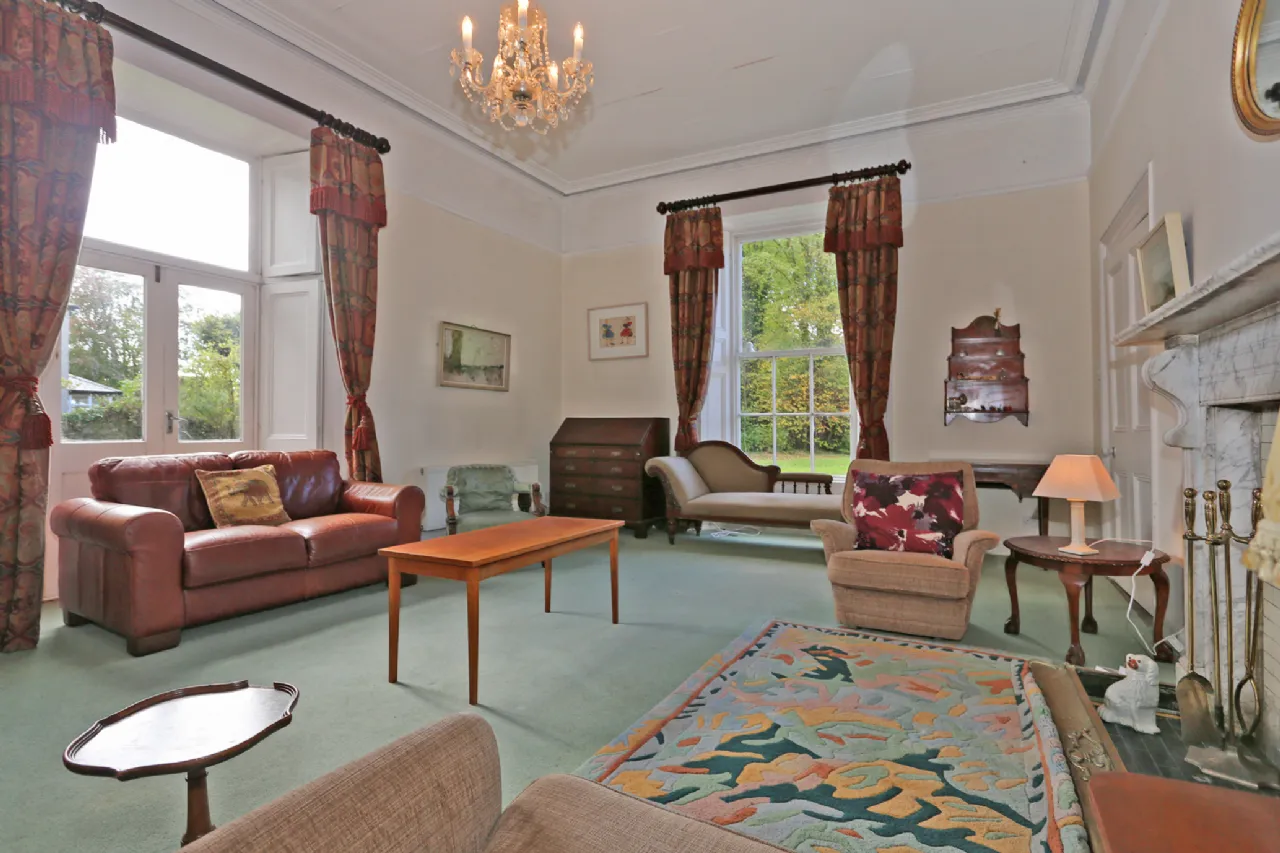 Drawing Room With ceiling coving, feature fireplace with open fire, tiled hearth and marble surround, French doors to garden with shutters, sash window with shutters, picture rails and dado rails