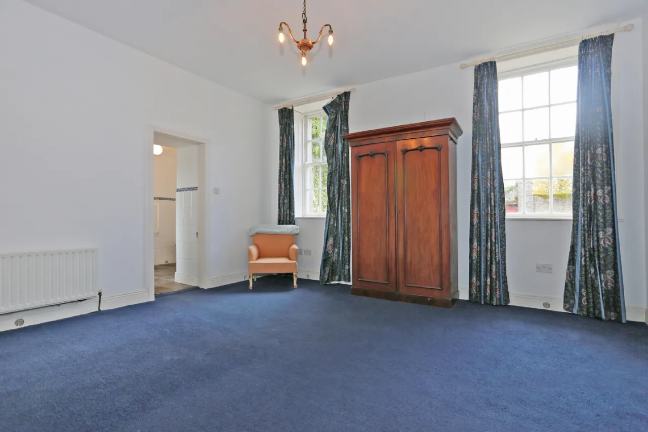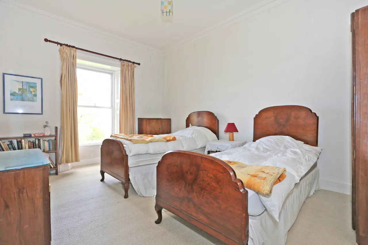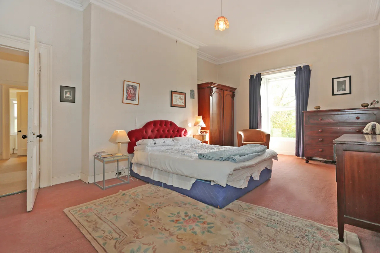 Principal Bedroom Spacious double room with feature fireplace and open fire with cast iron surround, dual aspect sash windows with shutters