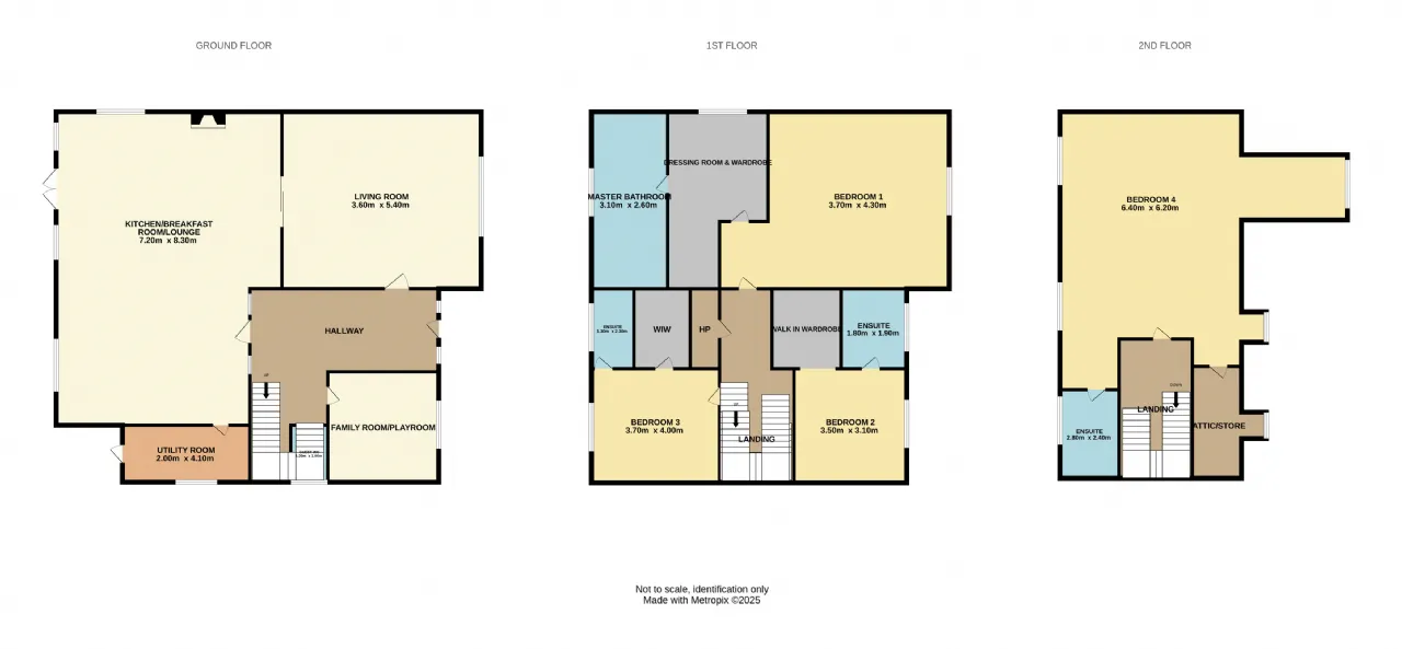 Upstairs, the first-floor features three spacious double bedrooms—each with fully tiled ensuite bathrooms and walk-in wardrobes. The principal suite is particularly impressive, stretching front to back, and includes an opulent ensuite with bath and separate shower, as well as an oversized walk-in wardrobe/dressing room.