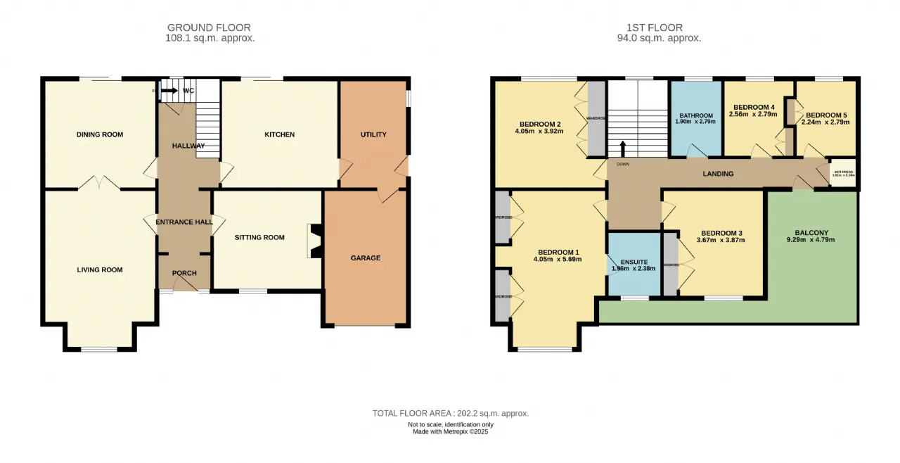 A separate utility room provides additional storage and can be accessed through the side of the house and the adjoining garage, which features hanging storage units and a car space. Upstairs, the home offers five bedrooms, making it a perfect fit for growing families. The primary bedroom is a large double with built-in wardrobes, front aspect view, and an en-suite. Two more double bedrooms—one front-facing and one rear-facing—also feature built-in wardrobes and generous proportions.