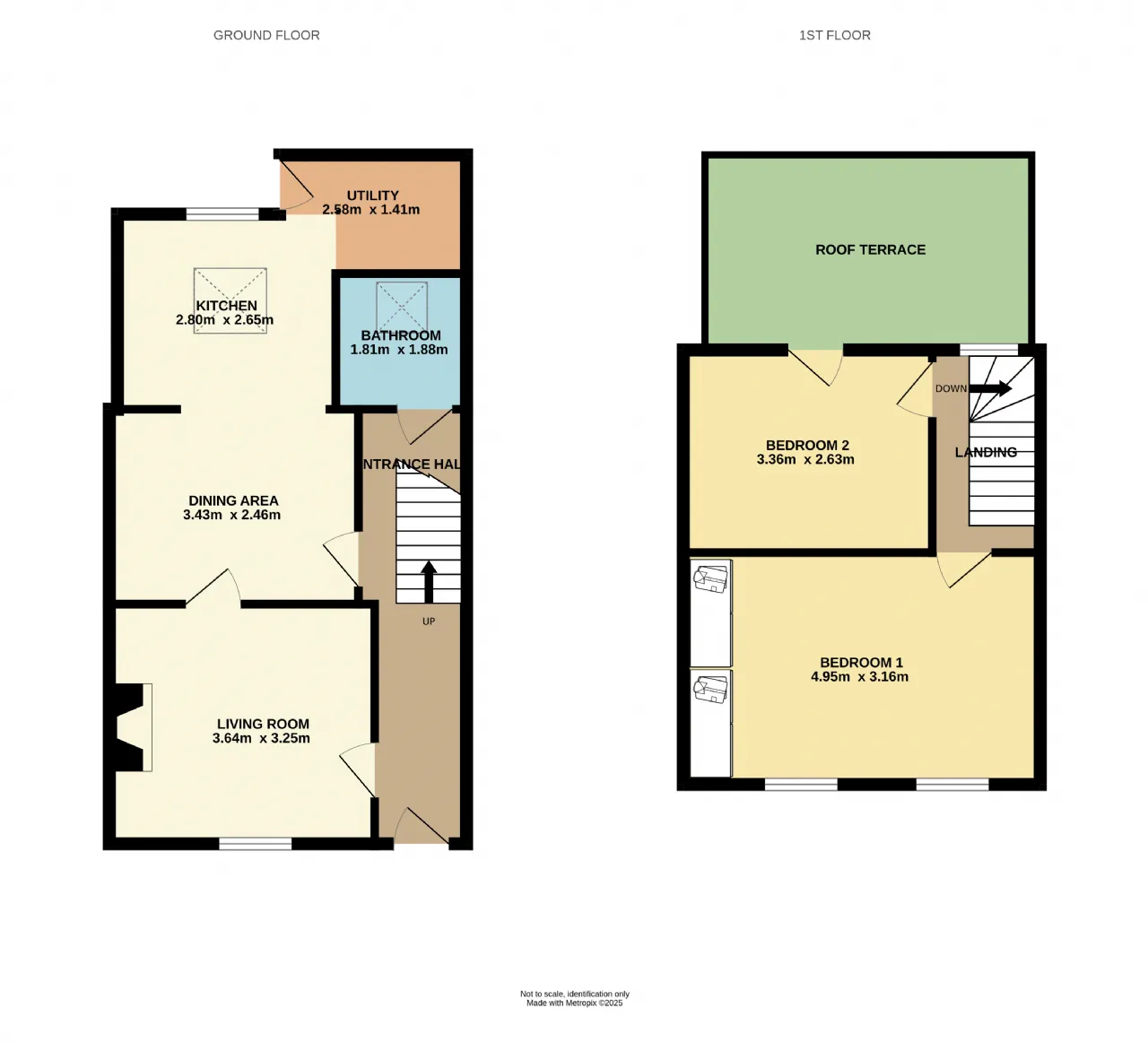 Well presented and ready for immediate occupation, the property has been recently painted and new carpets fitted. On entering the hall door you are greeted by an entrance hall with wood flooring, a door to the left leading to the living room, a bright, yet cosy reception area with a feature fireplace providing the focal point. There is a door to the dining area, which in turn opens to the kitchen, with a space behind for utilities and a door to a rear yard. There is a downstairs bathroom with part tiled walls, panelled bath, wash hand basin and WC. Upstairs are two double bedrooms, the room to the front spanning the width of the house, with fitted wardrobes and wooden floors. The rear bedrooms opens onto the roof terrace and provides a lovely outdoor area to relax and unwind.