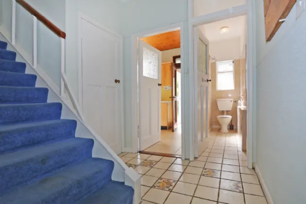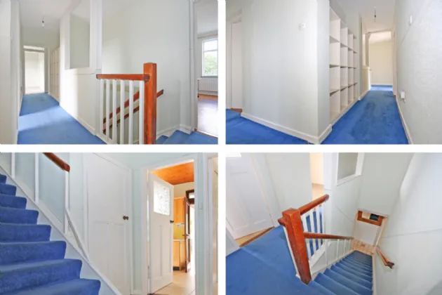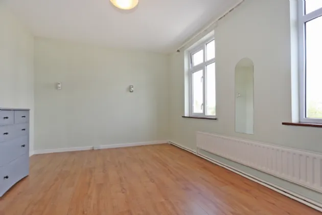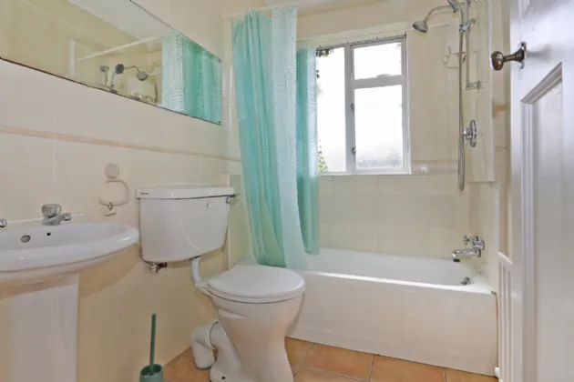 Upstairs, the master suite offers a walk-in wardrobe, additional sliding wardrobes for extra storage, and a private ensuite bathroom with a shower. Bedroom two is another generously sized double room with built-in wardrobes. There are two additional double bedrooms and one single bedroom, all spacious and well-proportioned. A main family bathroom is located off the hallway and comes fully tiled and fitted with bath with overhead power shower.