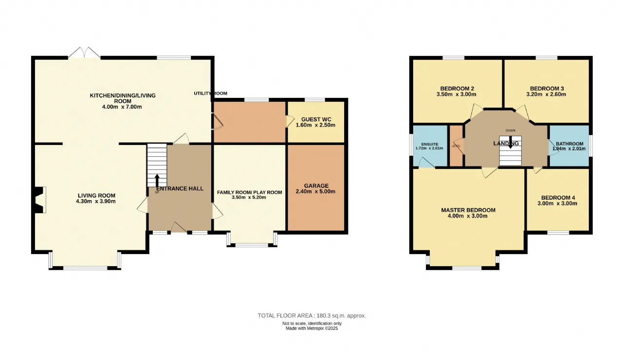 1st floor: 4 bedrooms, ensuite & main bathroom. Large attic for storage. Garage to side of property.