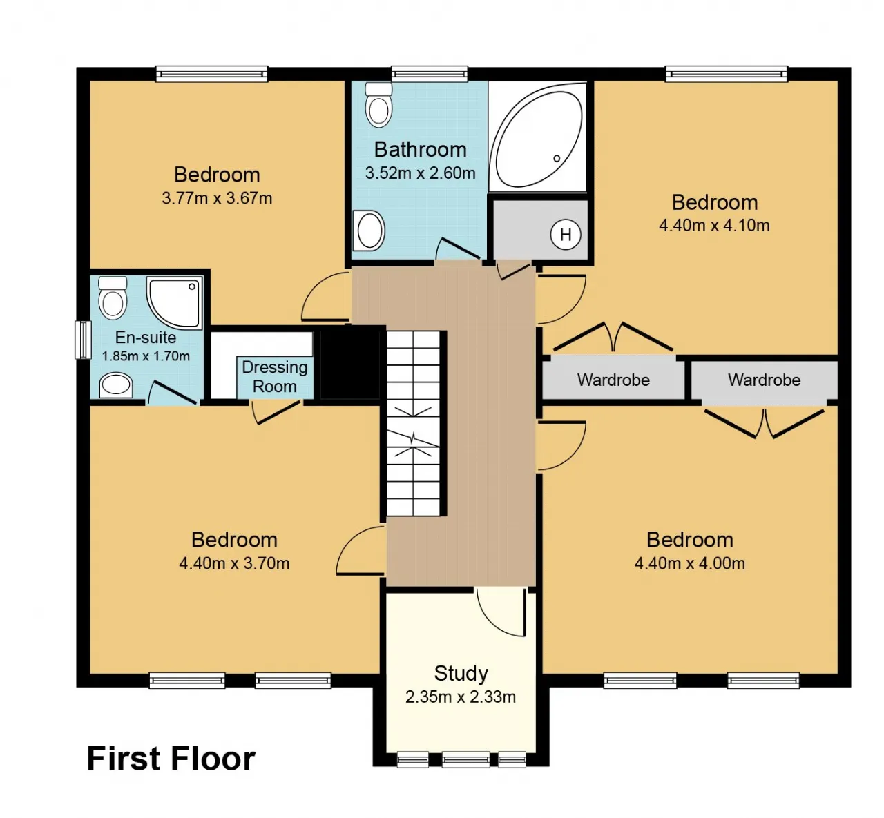 On the first floor there are 4 double sized bedrooms. The main bedroom has an ensuite shower room and a walk in wardrobe. The other 3 bedrooms are served by a fully tiled family bathroom with a large jacuzzi bath. There is a study, which is ideal for anyone working from home taking advantage of the fibre to the home broadband available. On the second floor there is an additional bedroom, a storage room and large landing area, that is a great spot for a bit of gaming.