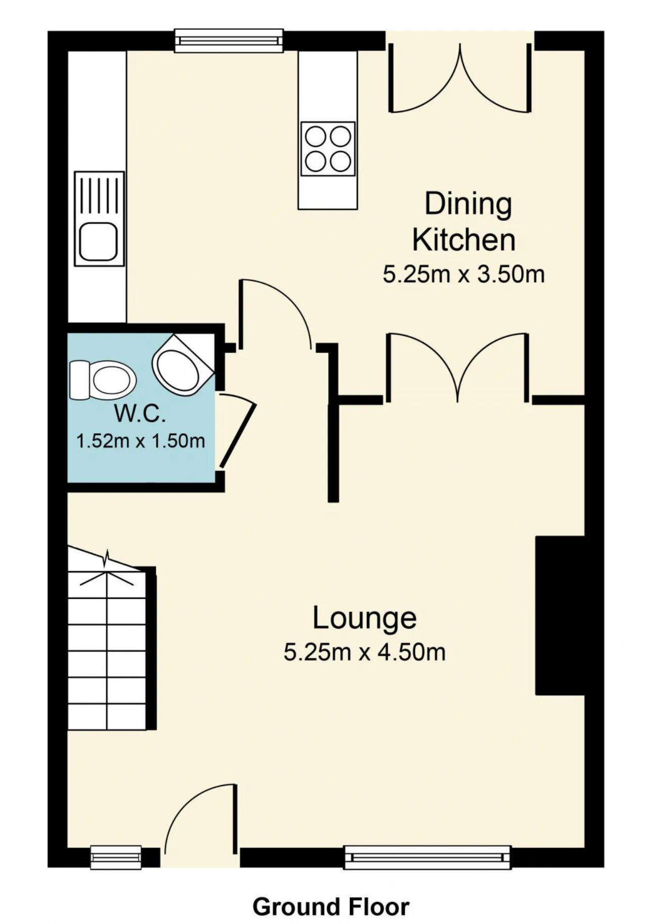 Entering the house there is no wasted space, you are straight into the bright living area with solid wood floors and a solid fuel stove. Double frosted glass doors open into the kitchen / dining area with tiled floors, built in kitchen units, breakfast bar area, integrated fridge freezer, and electric cooker & hob. Double glass doors open out onto the south facing rear garden, ensuring a bright room throughout the day. There is also a downstairs WC & WHB.