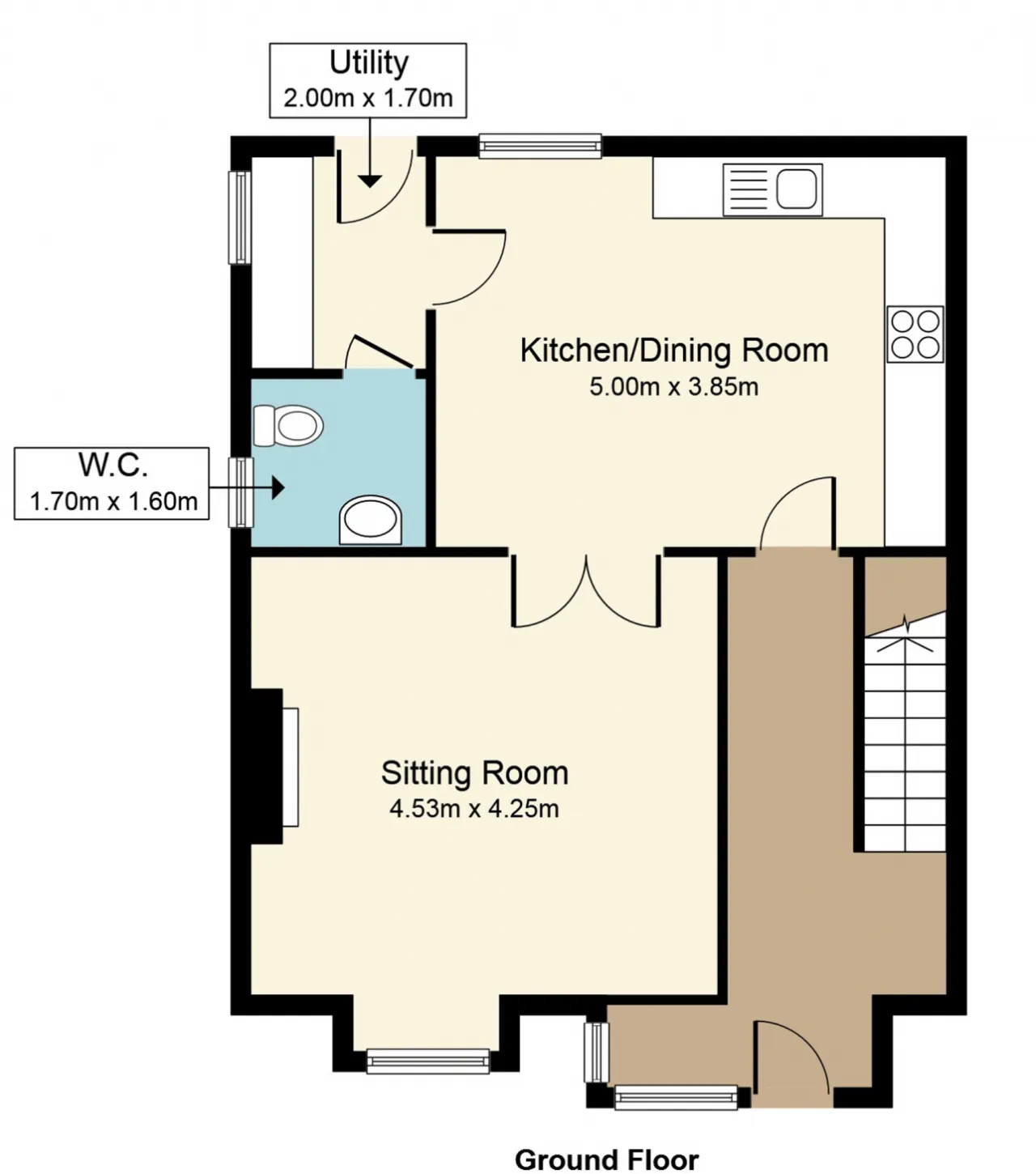 The house features a large living room with open fireplace and laminate flooring and double doors through to the kitchen / dining area. With tiled floors and built in units the kitchen is a bright area that looks out onto the rear garden with a south east facing aspect. Off the kitchen is a utility area plumbed for washing machine with access to the rear garden and a downstairs toilet.