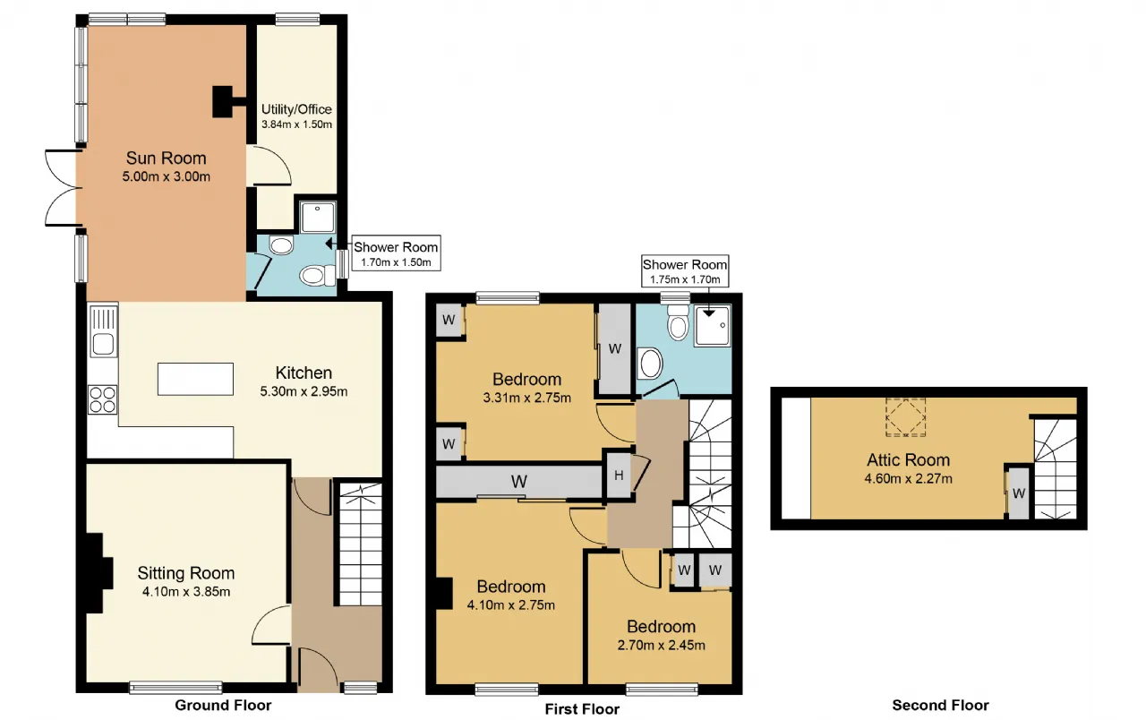 On the first floor there are two double sized bedrooms, and a single bedroom that could still take a double bed. The shower room has contemporary style tiling and fittings. There is also an attic room accessed via a stairs that could be used as a games room or an ideal home office for remote working taking advantage of the fibre and cable broadband available.