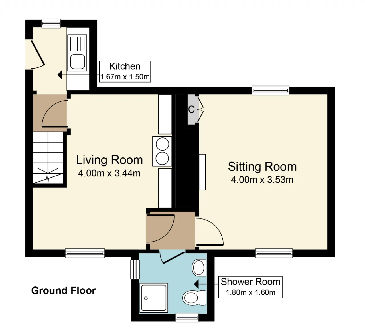 The house is a traditional ‘two up, two down’ house. Entering the house there is a small kitchenette. The living room area has a Stanley oil range that heats the room. The sitting room has a Stanley solid fuel insert stove. There is also a ground floor shower room with a Triton Electric shower. Upstairs there are two bedrooms both with original wood panelled ceilings.