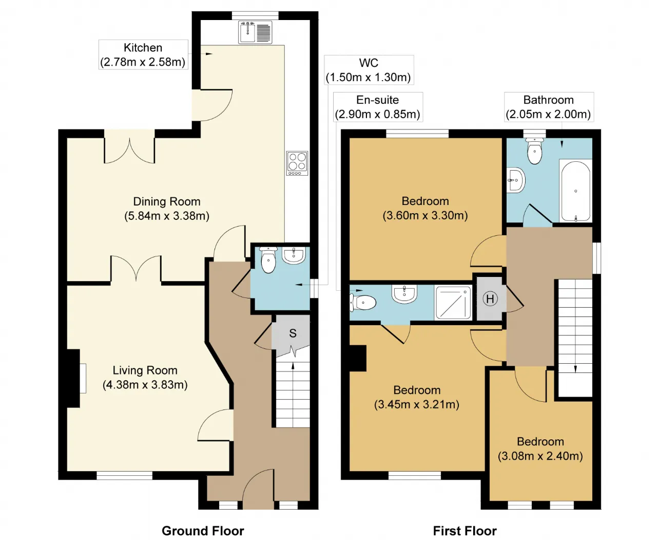 Upstairs the main bedroom has an ensuite shower room with a new electric shower, tray and some fresh tiling. There is a second double sized bedroom and the smaller single bedroom could be an ideal home office to take advantage of the fibre to the home broadband available. There is a semi tiled family bathroom.