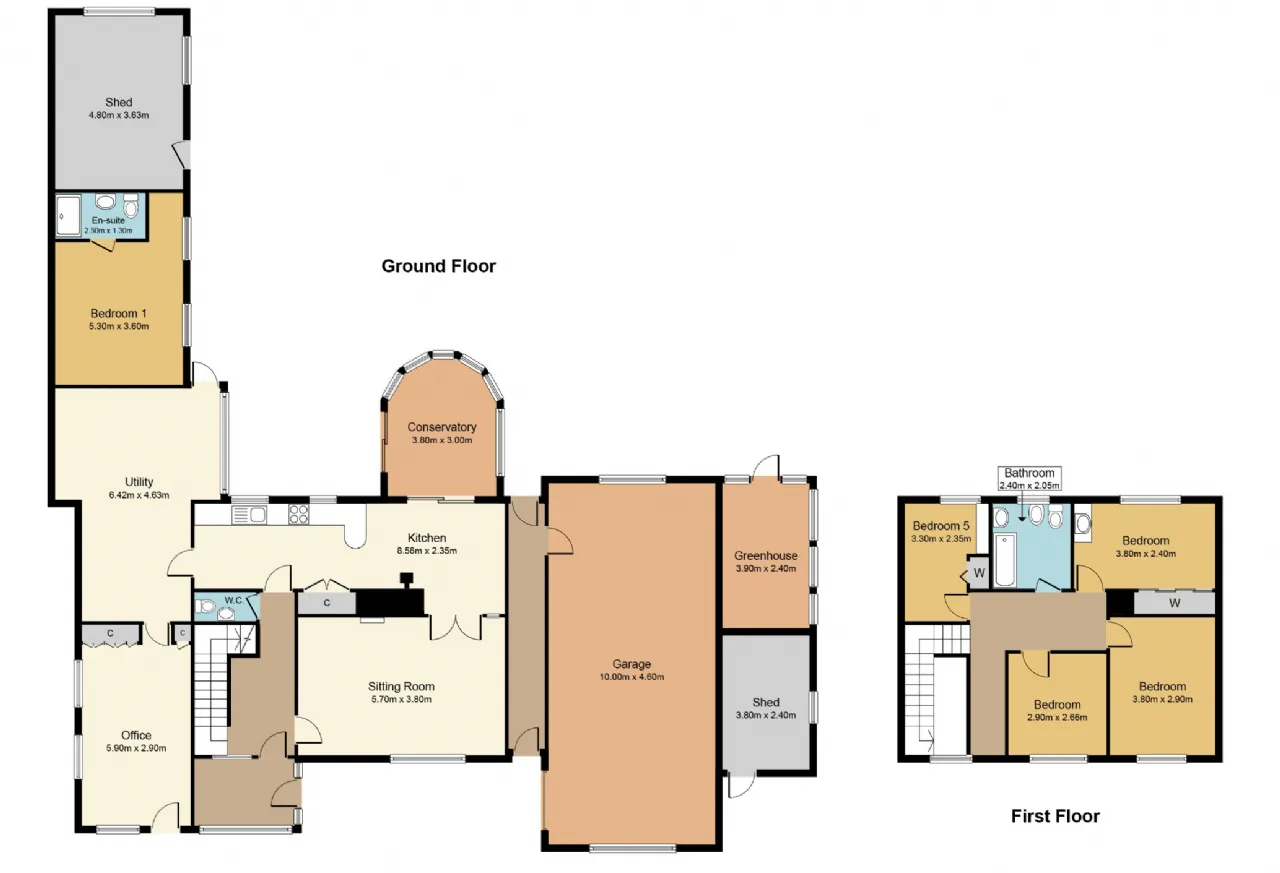 There is also a modern ground floor bedroom with ensuite wheelchair accessible wet room shower. On the first floor there are another four bedrooms and a family bathroom.