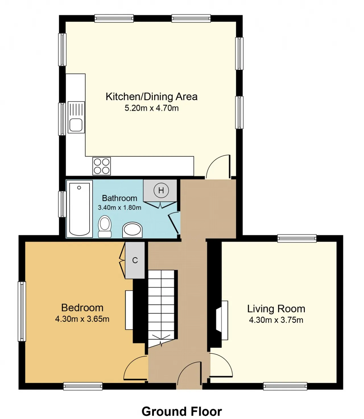 The kitchen / dining area is to the rear, it has built in kitchen units and features a vaulted high ceiling. It’s a bright room with windows to three different aspects of the room. Beside the kitchen is a modern bathroom with a combination of tiles and wainscot panelling.