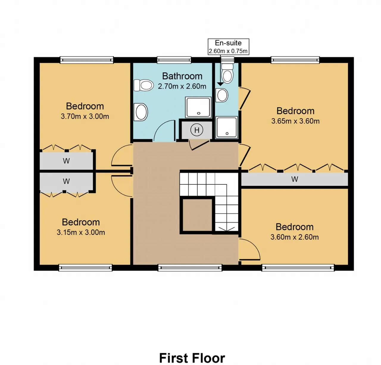 Upstairs there are 4 double sized bedrooms. The main bedroom is spacious with built in wardrobes and has an ensuite shower room. There is a large family shower room that is fully tiled. One of the bedrooms is currently used as a study / office taking advantage of the fibre to the home broadband available.