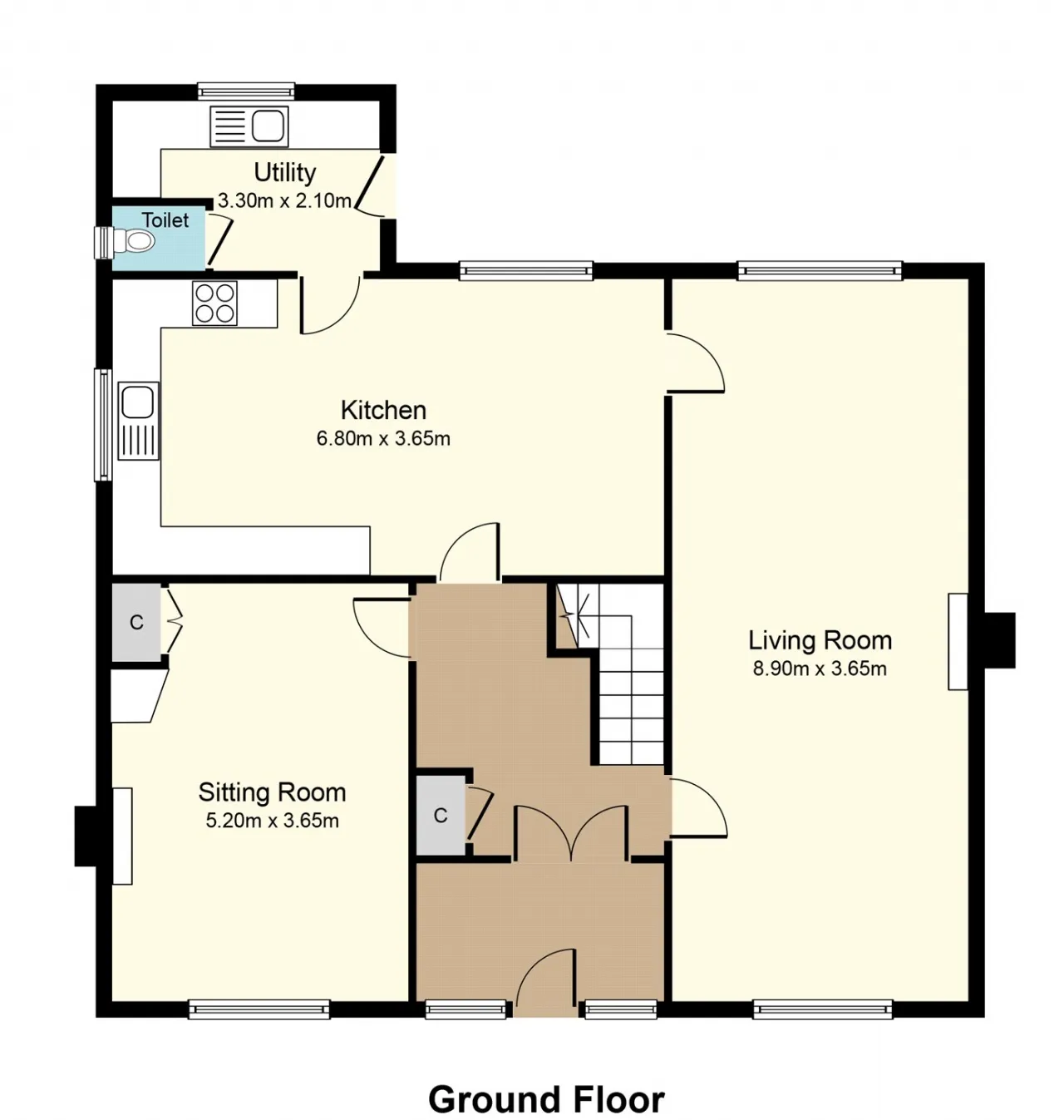 The sitting room has engineered wood floors and a modern fireplace with an insert solid fuel stove. There is a separate living room that runs from the front to the rear of the house with large windows ensuring a bright room throughout the day. This room also has a large solid fuel insert stove.