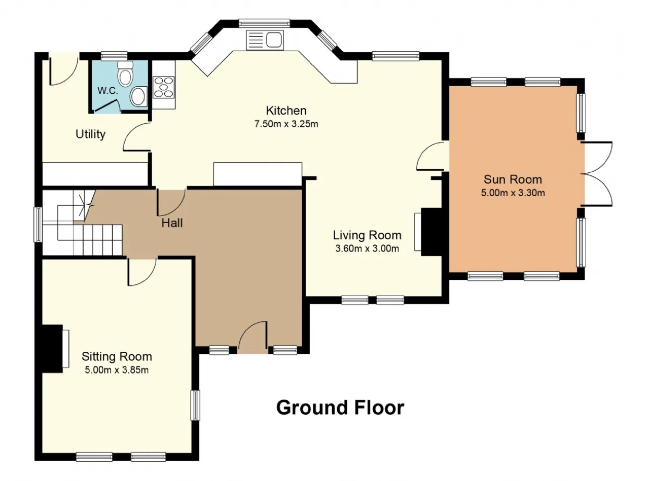 On the southern aspect of the house there is a sun room with windows to the east, south & west. Double glass doors open out onto the garden. A utility room is beside the kitchen has a tiled floor and clever built in units that maximises the space. There is a downstairs WC.