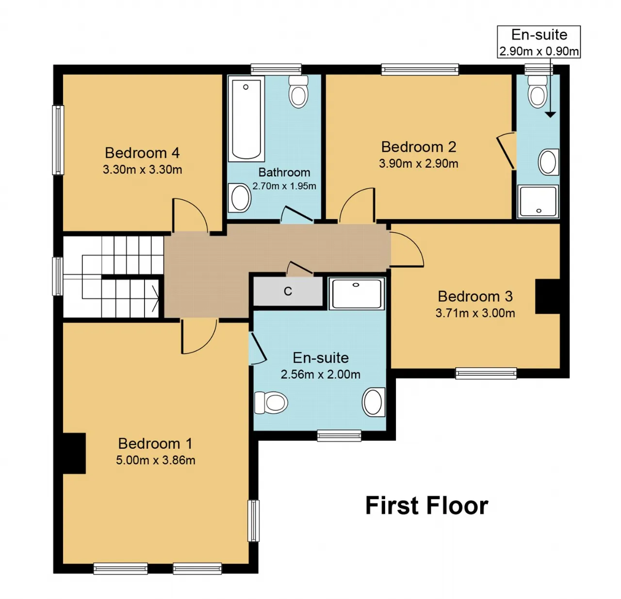 Upstairs there are 4 double sized bedrooms. The main bedroom is spacious and has an ensuite shower room. There is an additional ensuite bedroom and the other 2 bedrooms are served by a fully tiled family bathroom. One of the bedrooms is currently used as a study / office taking advantage of the fibre to the home broadband available.