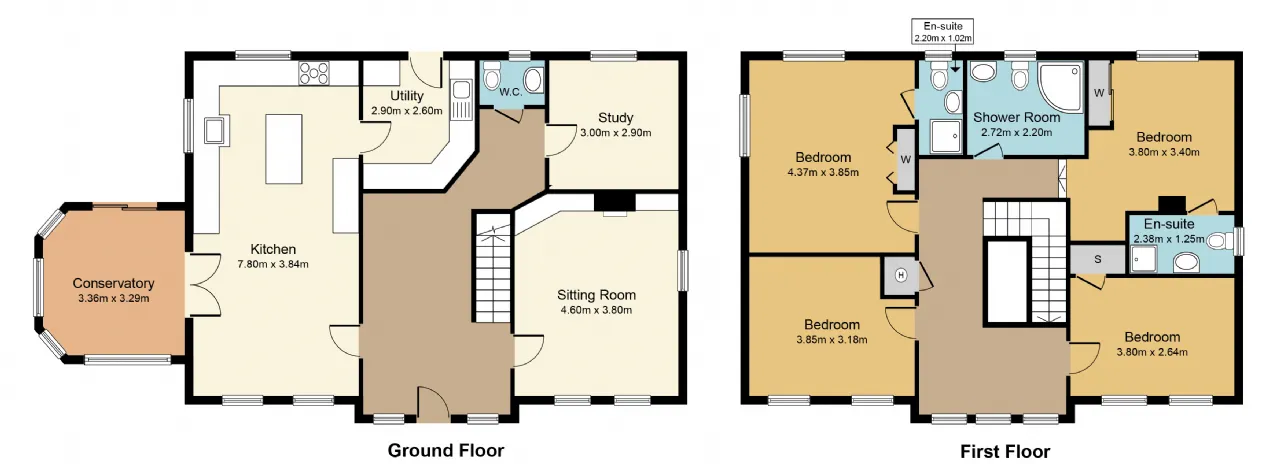 On the first floor level there are 4 bedrooms, all are double sized with built in wardrobes. Two of the bedrooms have ensuite shower rooms. The other two bedrooms are served by a large family bathroom.