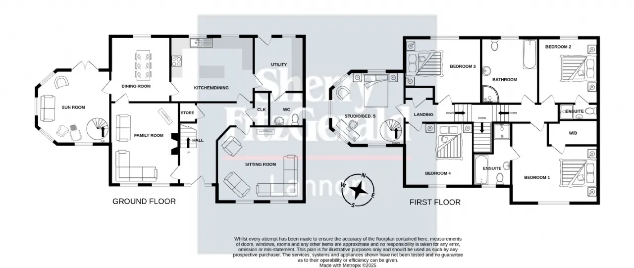 Accommodation to the Ground Floor briefly comprises of a large Sitting Room, Family Room, Kitchen/Dining room, separate Dining room, Utility room with WC and a west facing Sun Room. At First Floor level accommodation is equally spacious with 5 large double Bedrooms, 2 Ensuites, Walk-in-Wardrobe to Bedroom 1 and a very large family Bathroom.