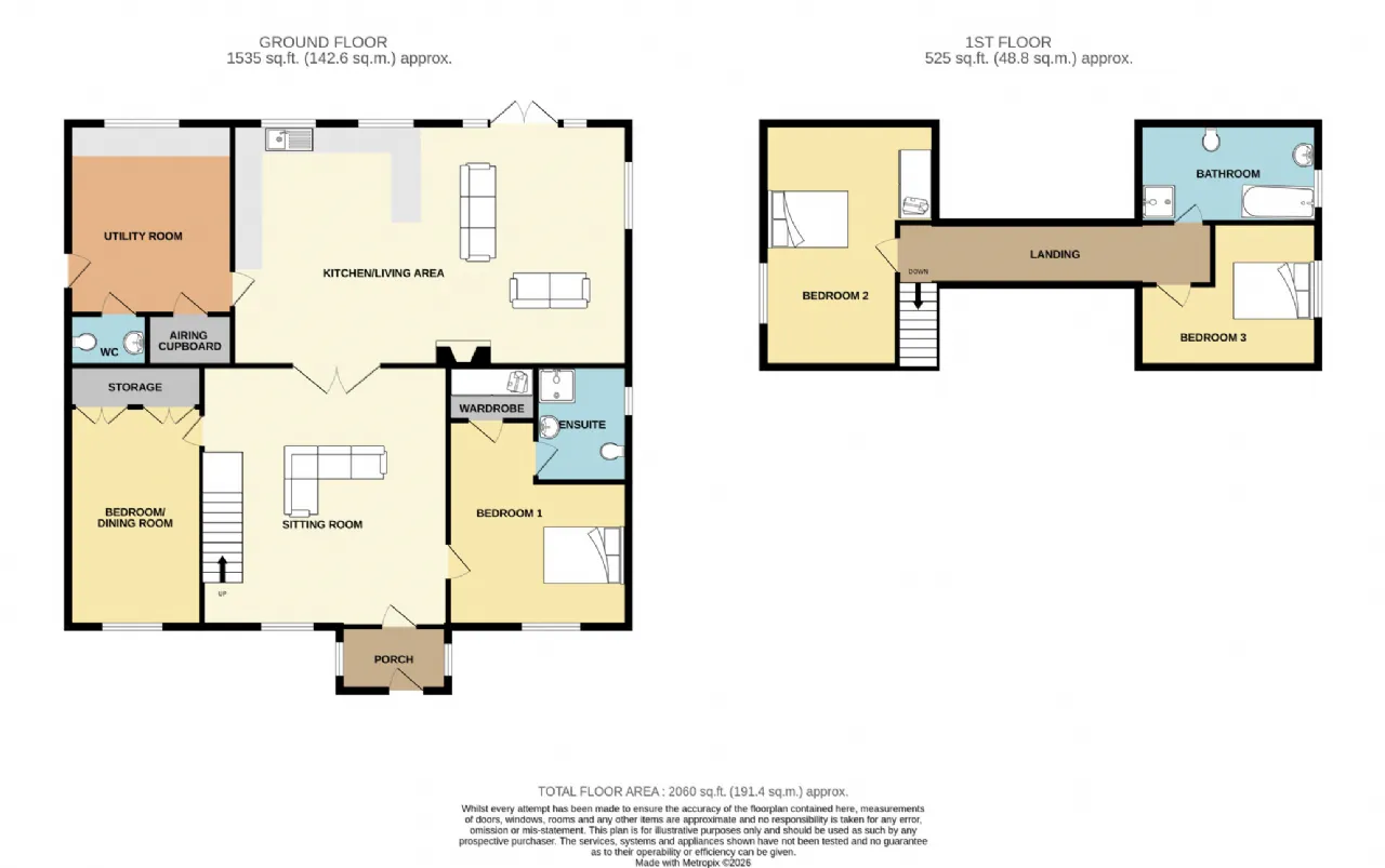 En-Suite 2.4m x 1.7m With tile floor and walls, double shower tray with glass screen and pumped shower, wash hand basin and WC.