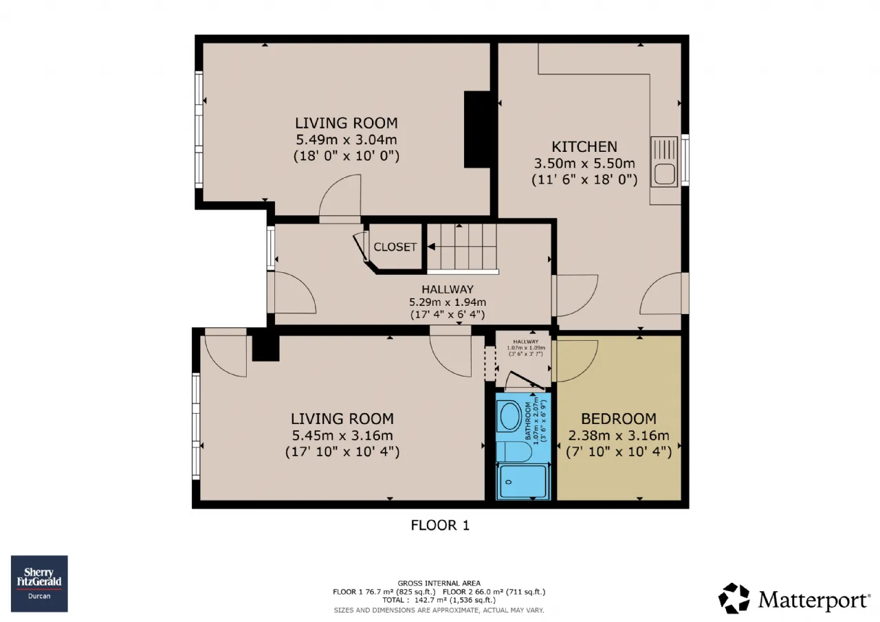 Living Room 5.49m x 3.05m with laminate wood flooring.
