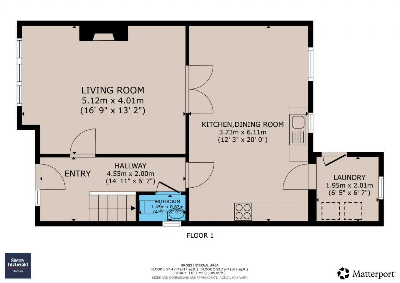 The kitchen and dining space is particularly generous, with plenty of room for a family-sized table and chairs, making it the heart of the home. Fitted units provide ample storage, and two windows offer views over the rear garden, while the light, neutral décor keeps the space bright and inviting. Just off the kitchen is a practical utility room, keeping laundry and household chores neatly out of sight, and providing direct access to the garden. Completing the ground floor is a conveniently located guest WC, ideal for visitors.