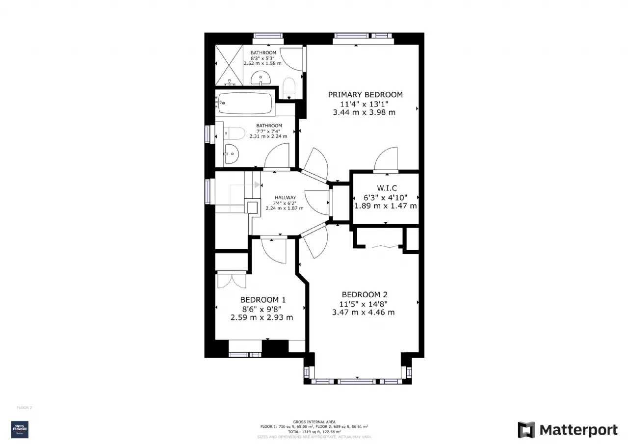 WC 1.45m x 1.57m with wc, semi-pedestal wash hand basin and porcelain floor tiles.