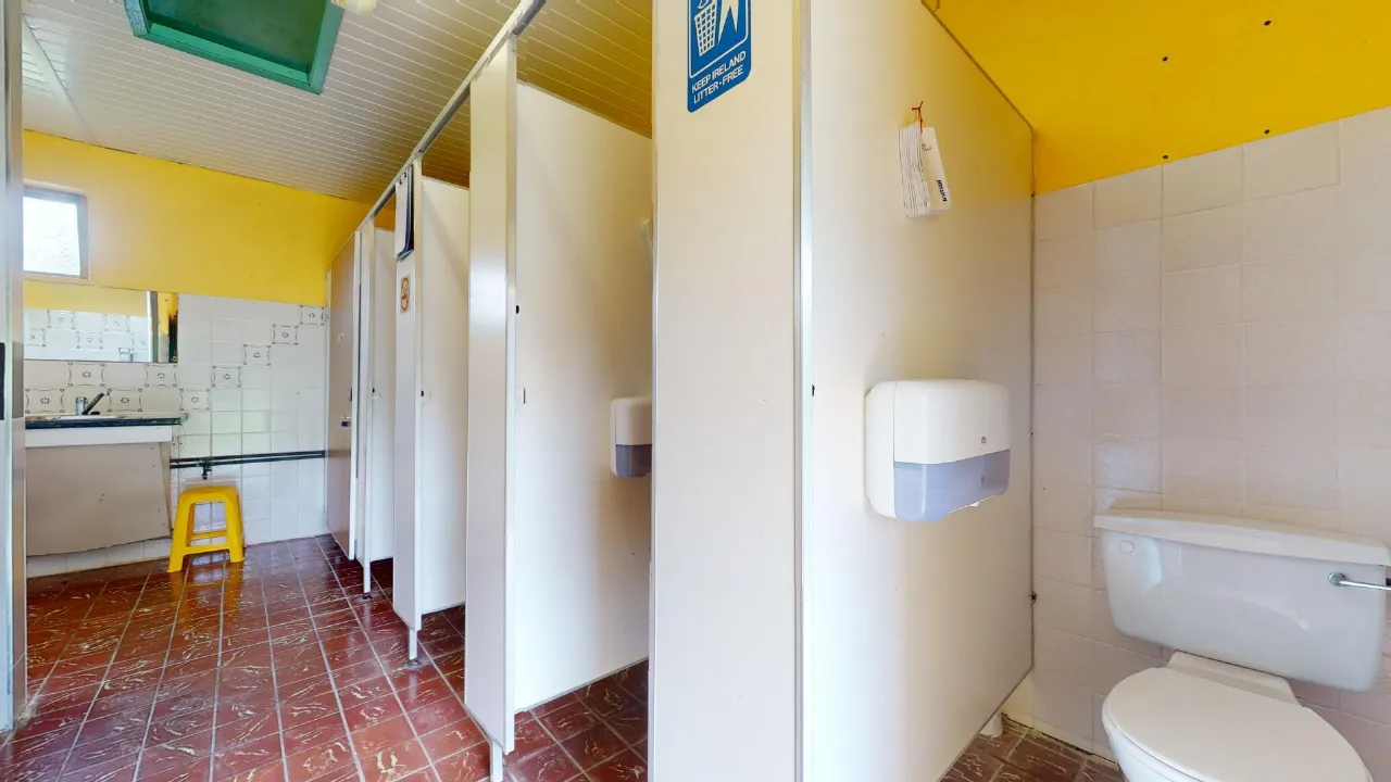 As you cross the road to the main camp area you will meet a number of additional storage shed and the large Games room. A short walk further down the park brings you to the shower block, which is divided into male & female area accessible from opposite sides of the building. Each area comprises five cubicles (one wheelchair accessible), three wash-hand basins, and three shower cubicles.