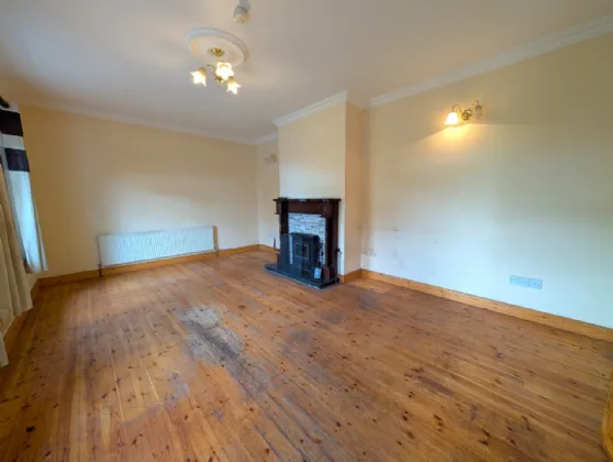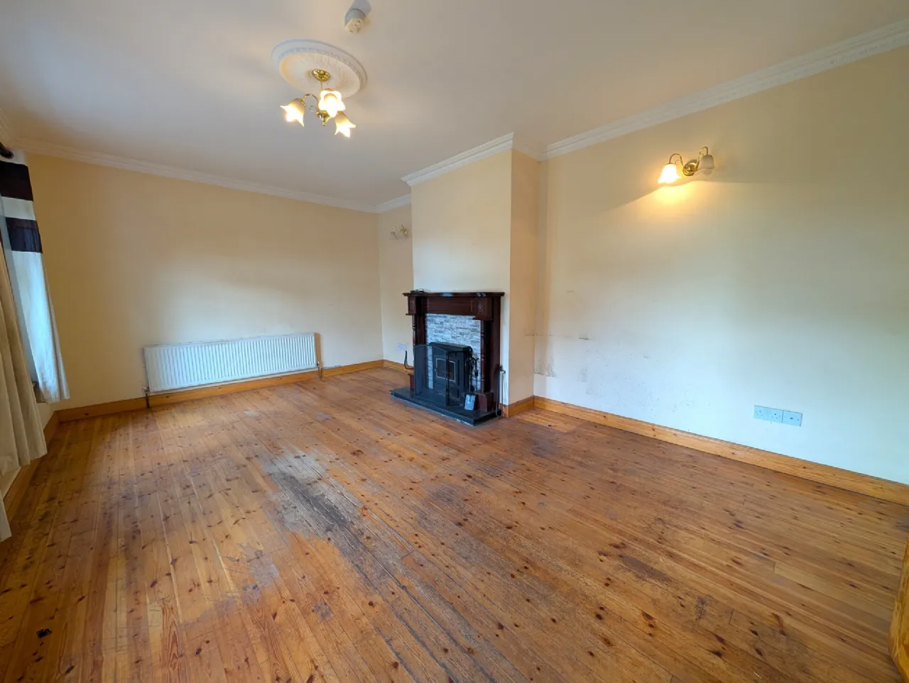 Living Room 3.6m x 5.5m Large room to the front of the house with solid timber floor, coving and fitted light futures to the ceiling, in-set stove with a timbe surround and granite hearth.