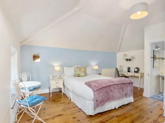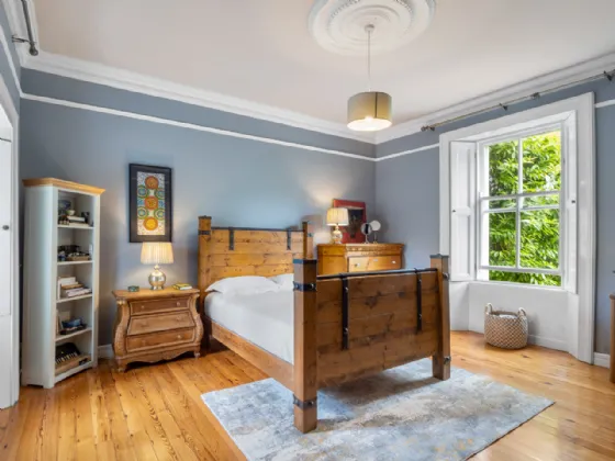 Master Suite 4.85m x 4.72n Solid wide board natural pine floor, Connemara marble fireplace with cast iron centre piece, built in wardrobes, original shutters, overlooking the river and garden.