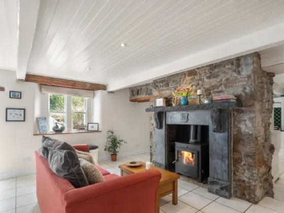 Dining Room 5.13m x 4.27m Tiled floor, tongue & groove ceiling with exposed painted ceiling beams, limestone fireplace with solid fuel stove and backboiler, access to courtyard