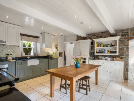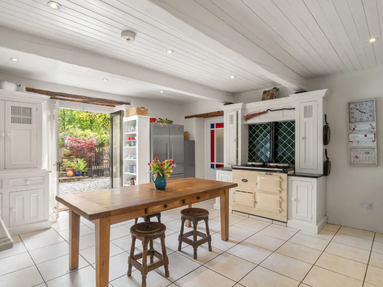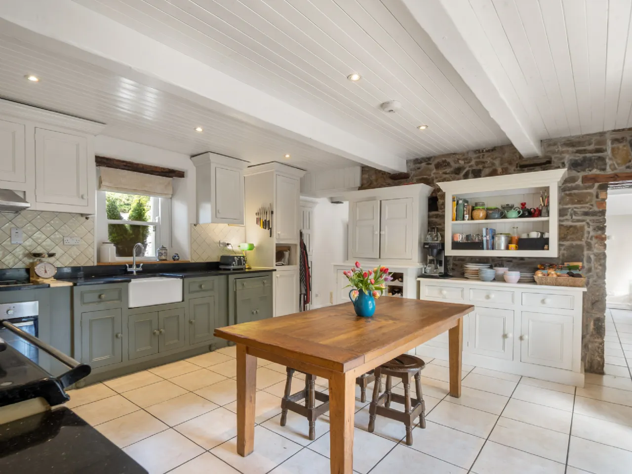 Kitchen 5.08m x 4.9m Tiled floor & splashback, Georgian cream painted hand crafted kitchen solid frame kitchen with shot in doors, larder, dresser unit, oil fired aga, integrated cooker, tongue & groove ceiling with exposed painted beams, feature exposed natural stone wall