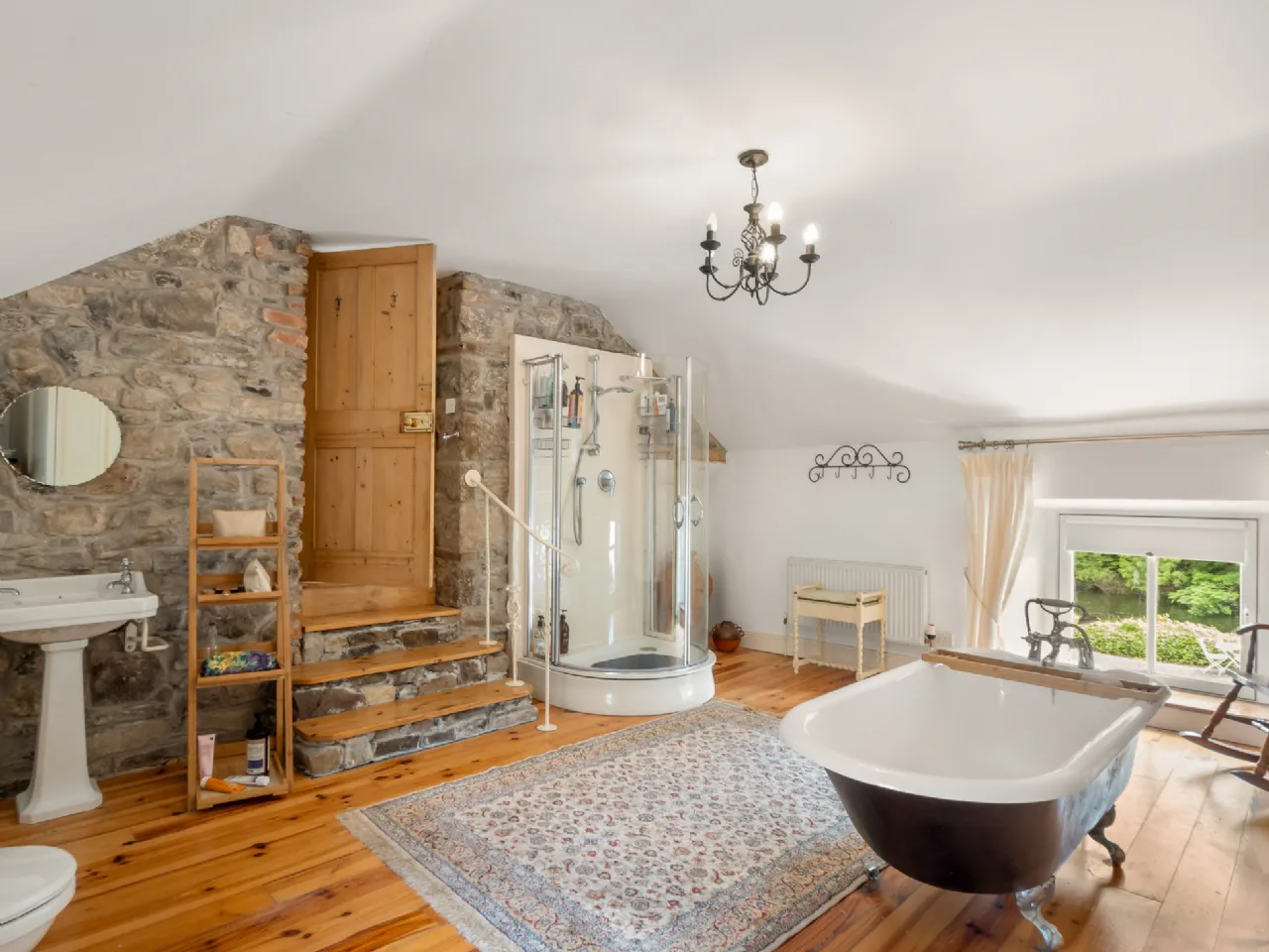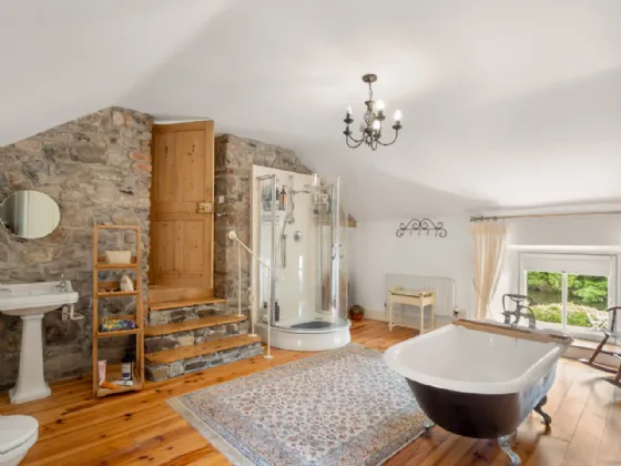 Main Bathroom 5.18m x 4.52m Step down entry with wrought iron handrail, wide board pine floor, exposed natural stone wall, hand crafted built in storage, hotpress, free standing clawfoot bath, power shower, wc, whb