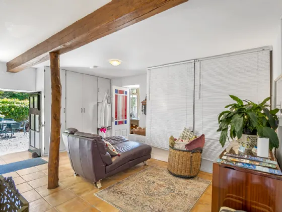 Lobby 5.29m x 4.21m Tiled floor, exposed beams, storage, double doors to courtyard