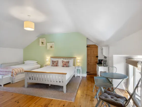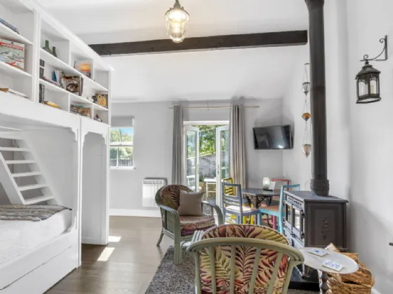 The studio has a custom-made feature mezzanine bunkbed, wood fire antique stove and en-suite shower room. This property is currently being utilised as guest accommodation but could easily be used as staff quarters.