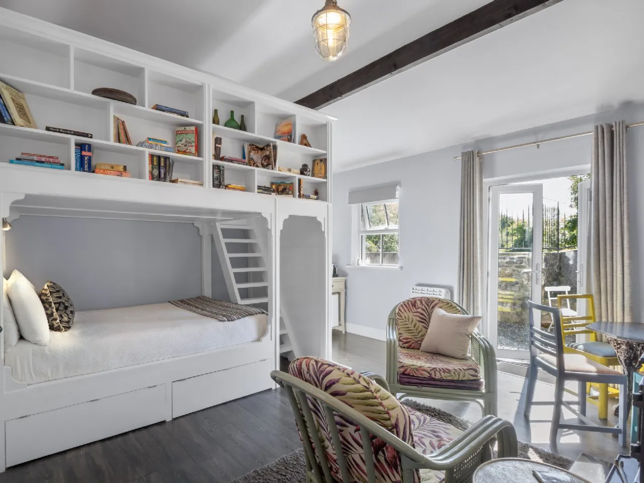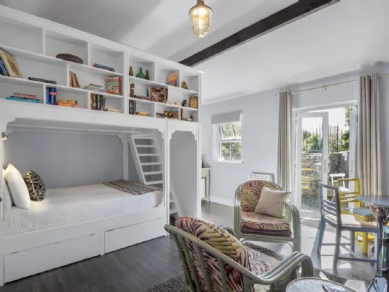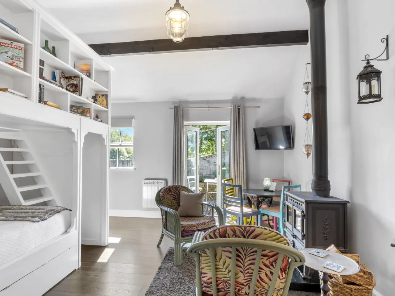 Bedroom/Living Room 4.4m x 4.1m & 1.3m x 0.95m Charcoal oak veneer flooring, custom made built in bunkbeds, solid fuel stove, double doors to courtyard