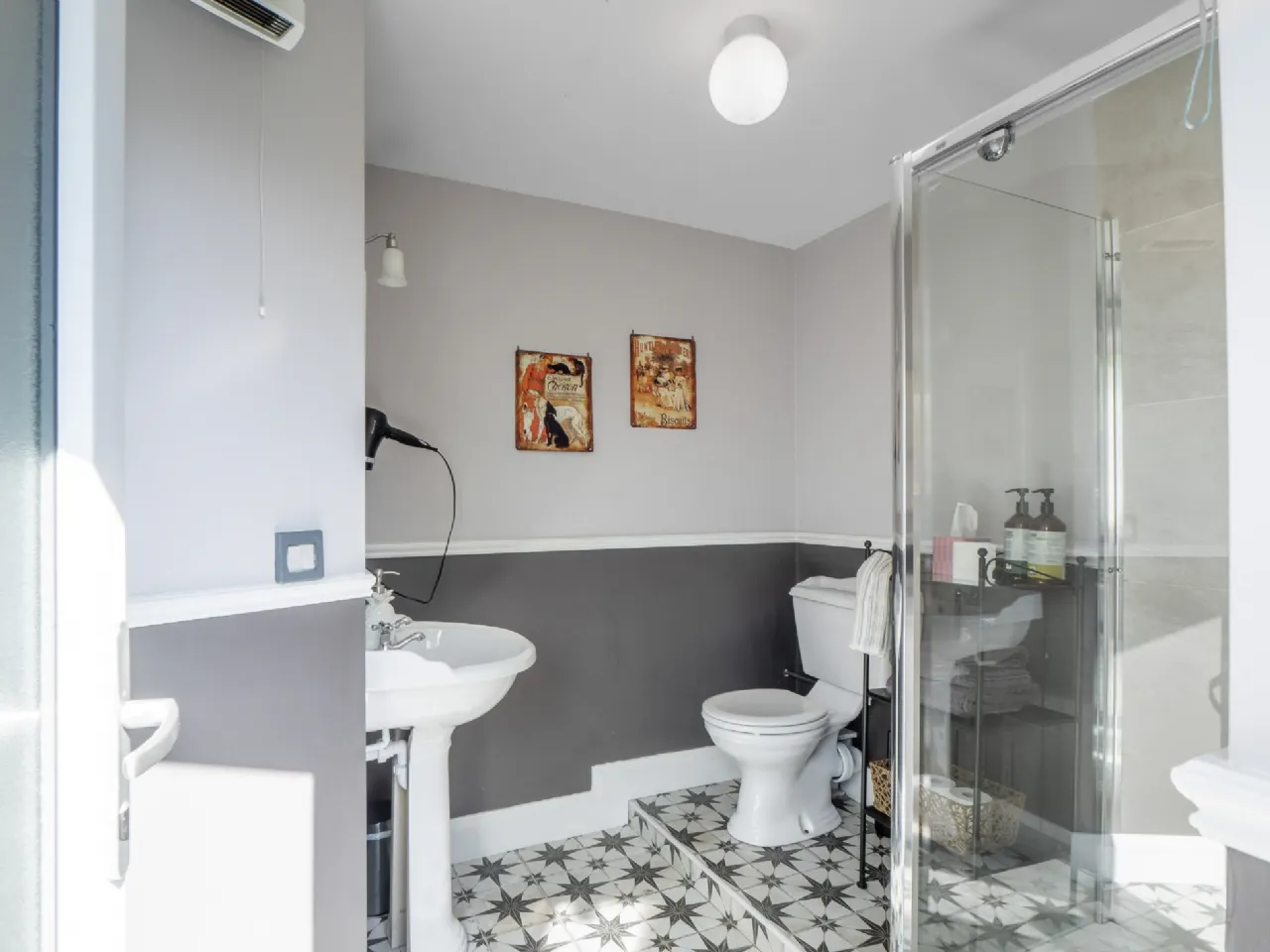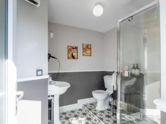 Guest Bathroom 2.12m x 1.85m & 1.3m x 0.7m Tiled floor & backsplash, electric shower, wc, whb