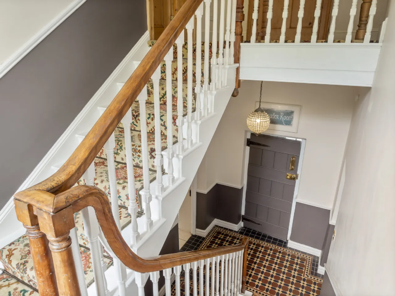 Front Staircase Mahogany staircase with carpet runner, half-landing with full height window and original shutters