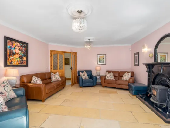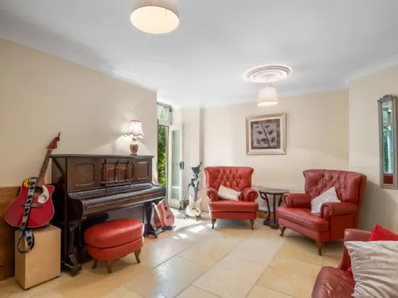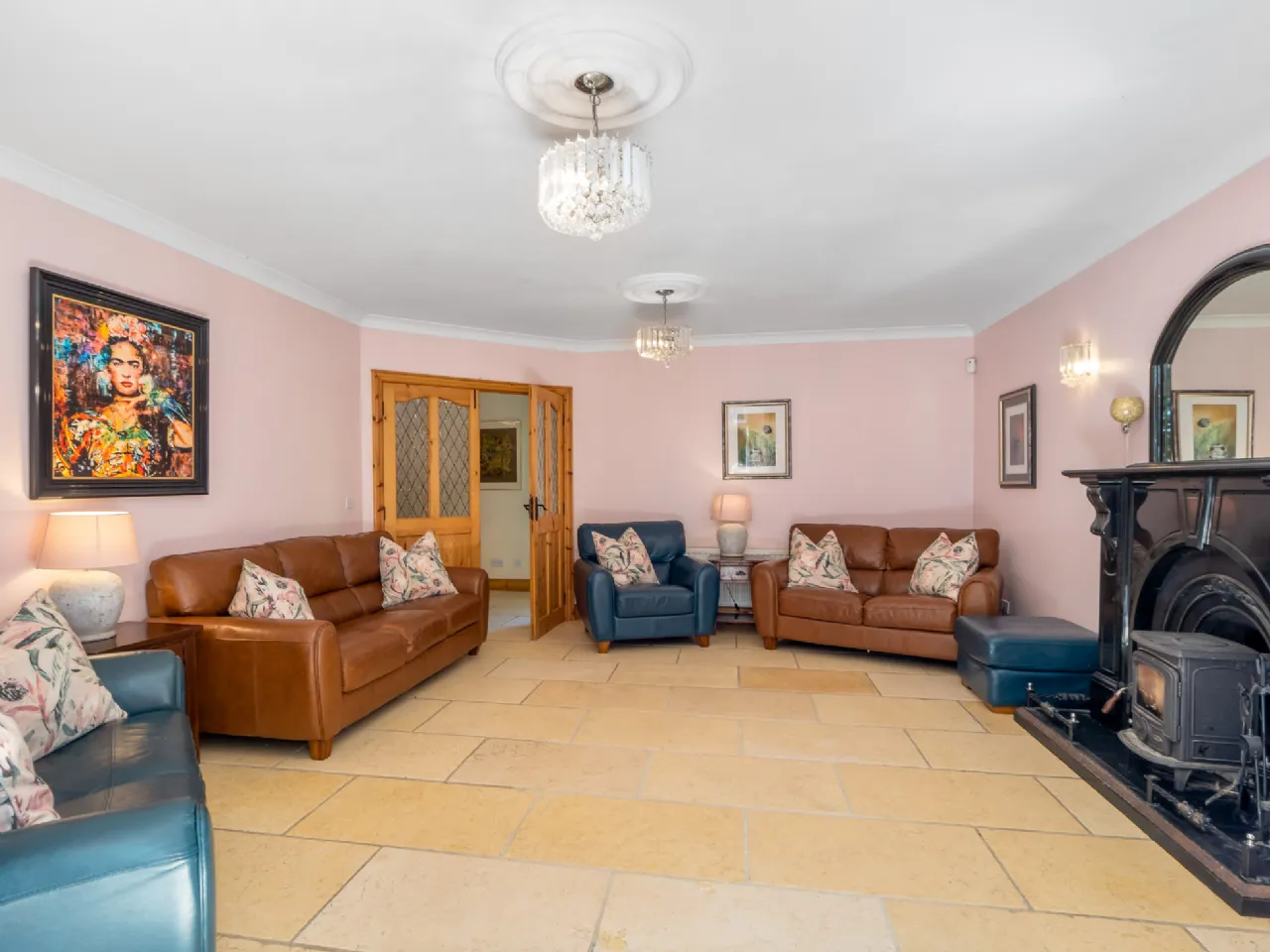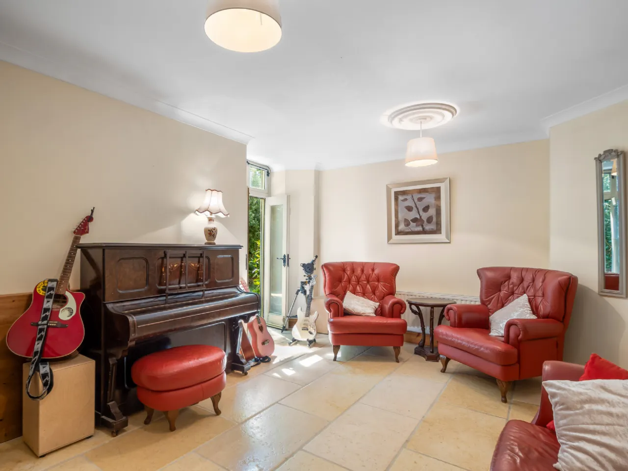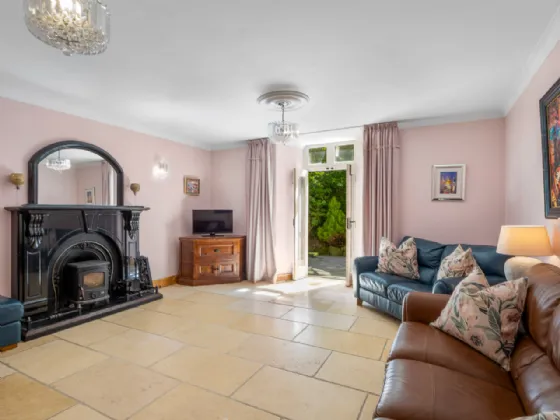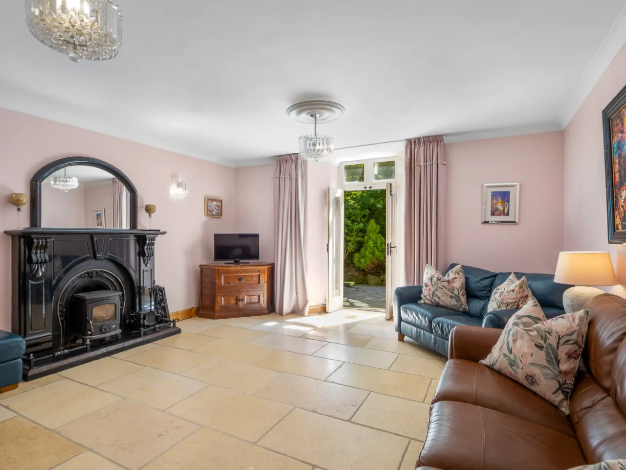 Living Room 5.67m x 4.7m Egyptian sandstone tiled floor, marble fireplace with solid fuel stove, cornicing, doors to garden, curtains