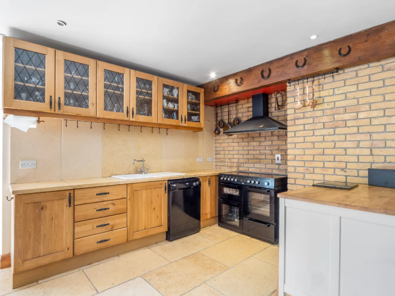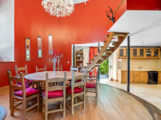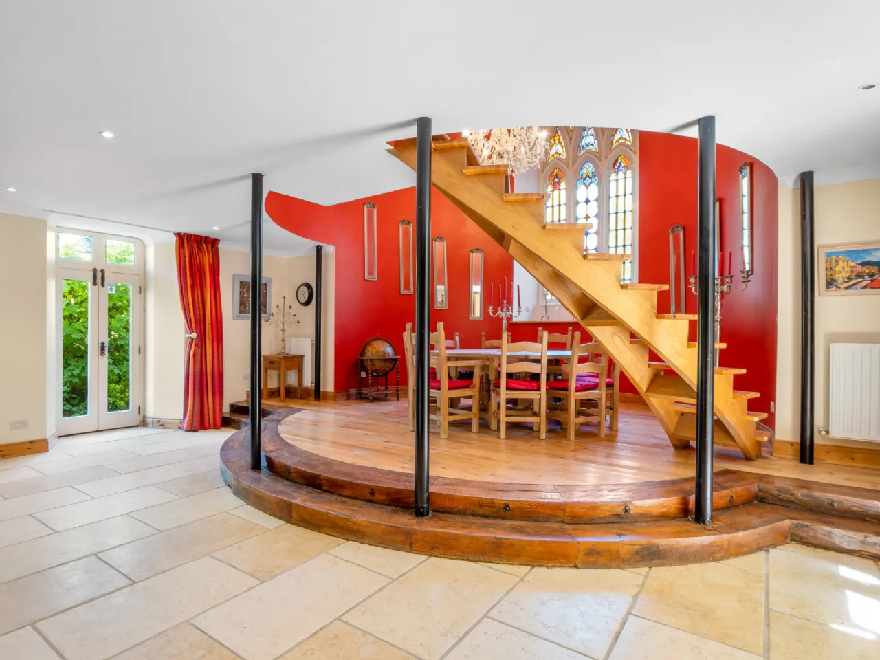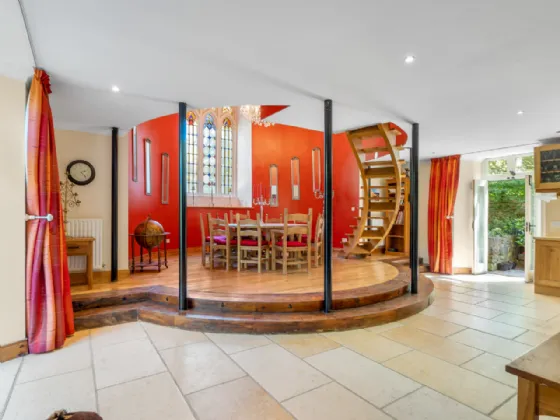 Kitchen Dining Room 7.2m x 6.6m & 5.1m x 3.1m Oak floor, feature stained glass window, raised dining area (original pulpit area) with some original timbers used to construct the steps, solid oak kitchen with tiled and brick back splashes, walk-in pantry, hand crafted sold oak open tread staircase (requires banisters), double doors on either side of room to the garden