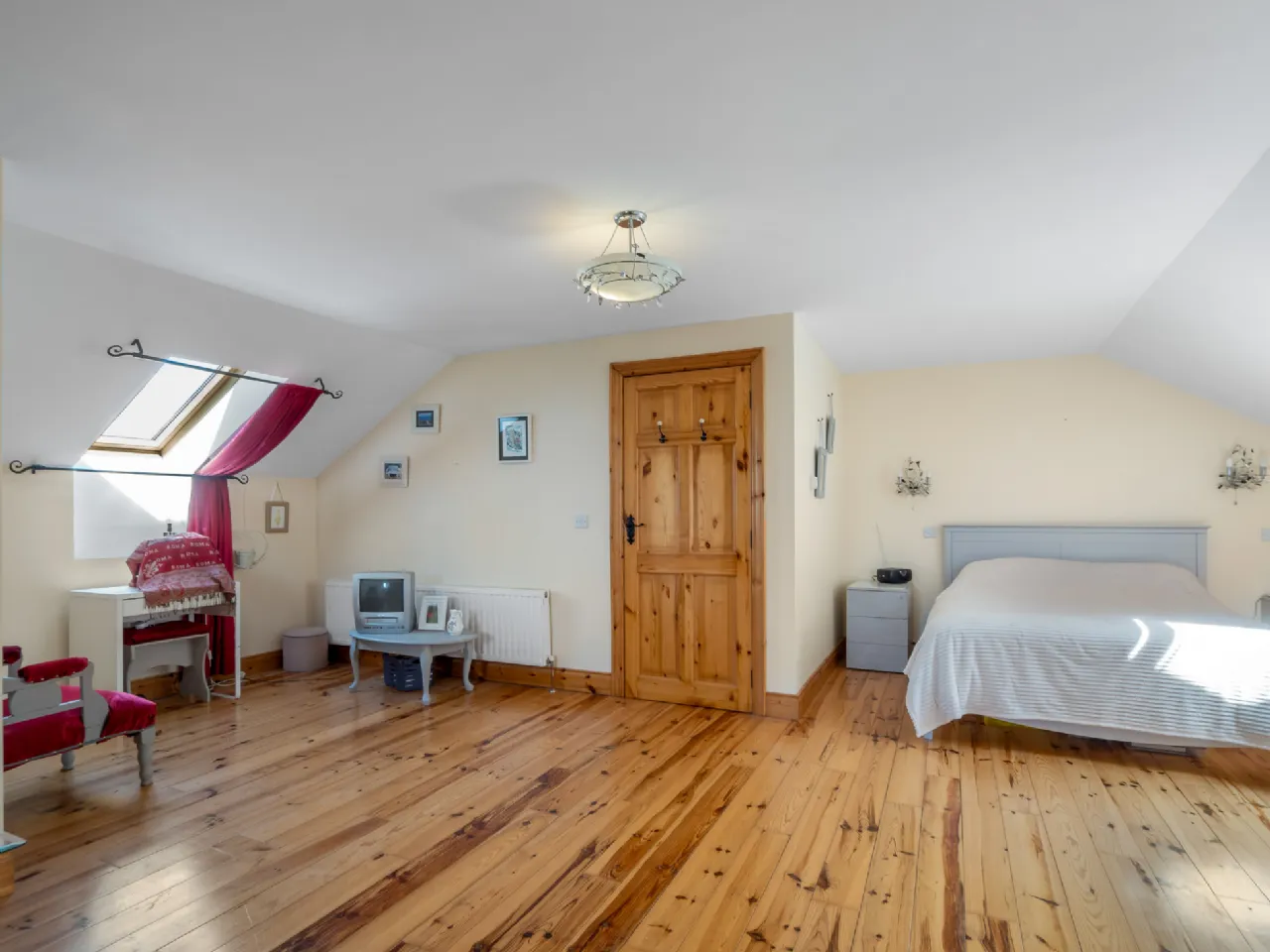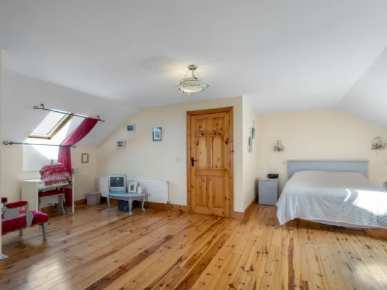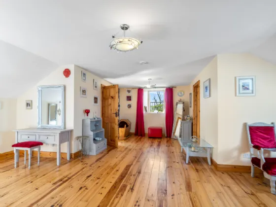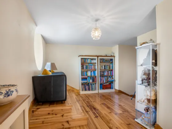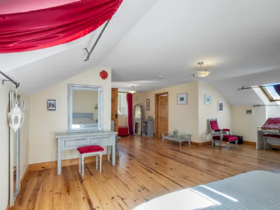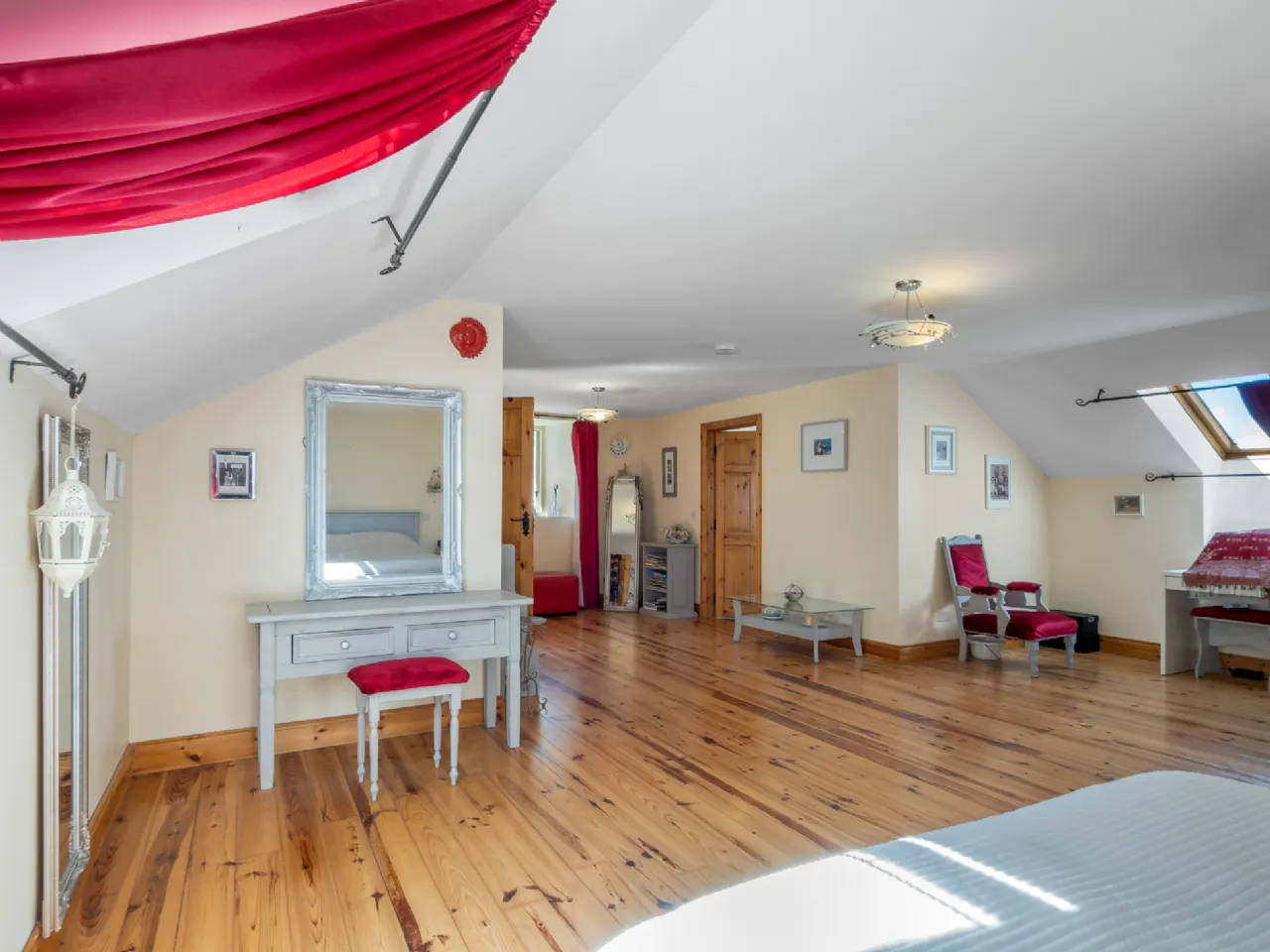 Office/Workroom 12.9m x 6.93m Substantial room which could suit for a number of uses, French pine floor, velux windows x 6, raised seating/display area