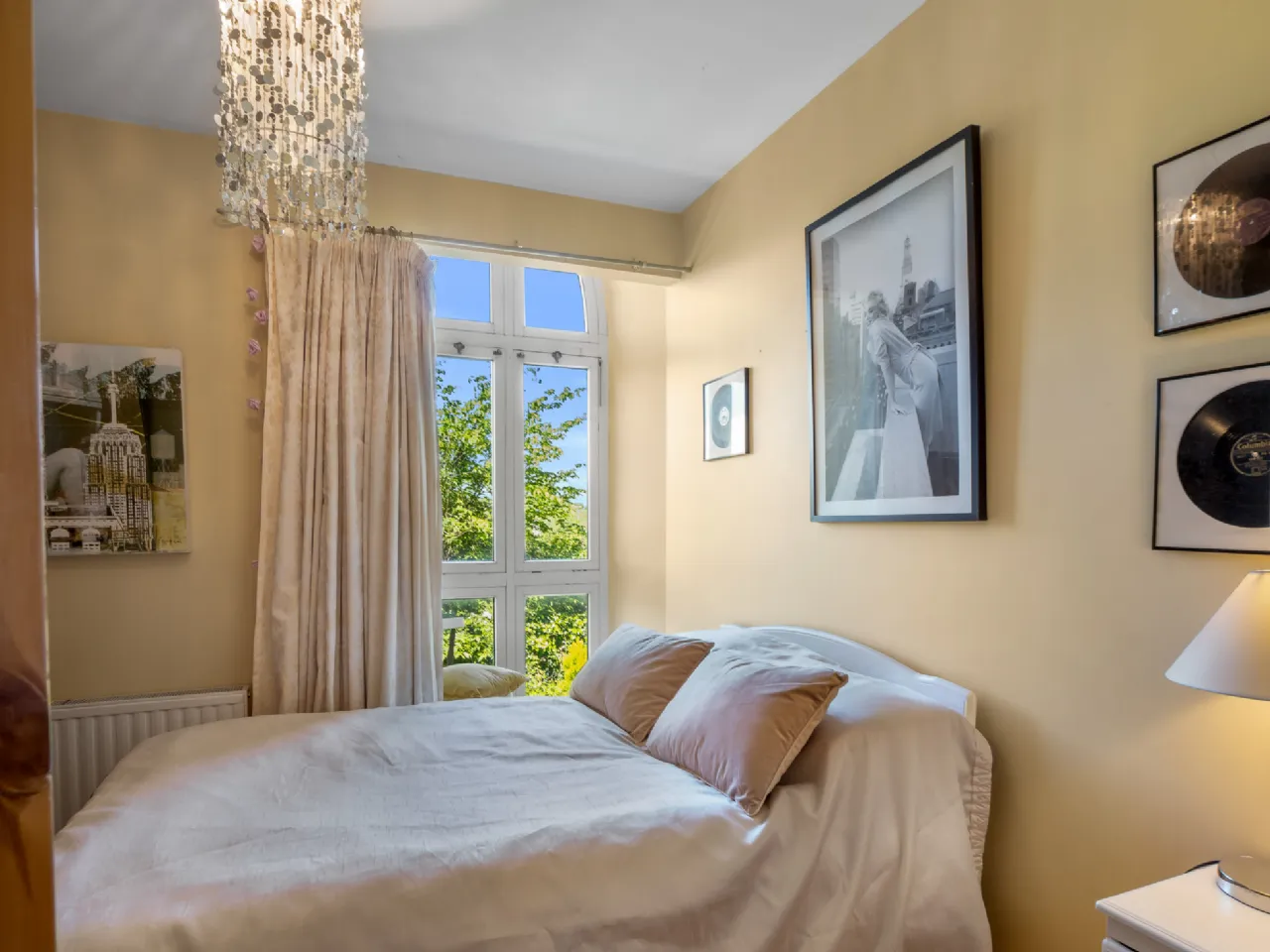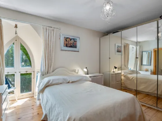 Bedroom Seven 3.9m x 3.29m French pine floor, pointed arch window, curtains