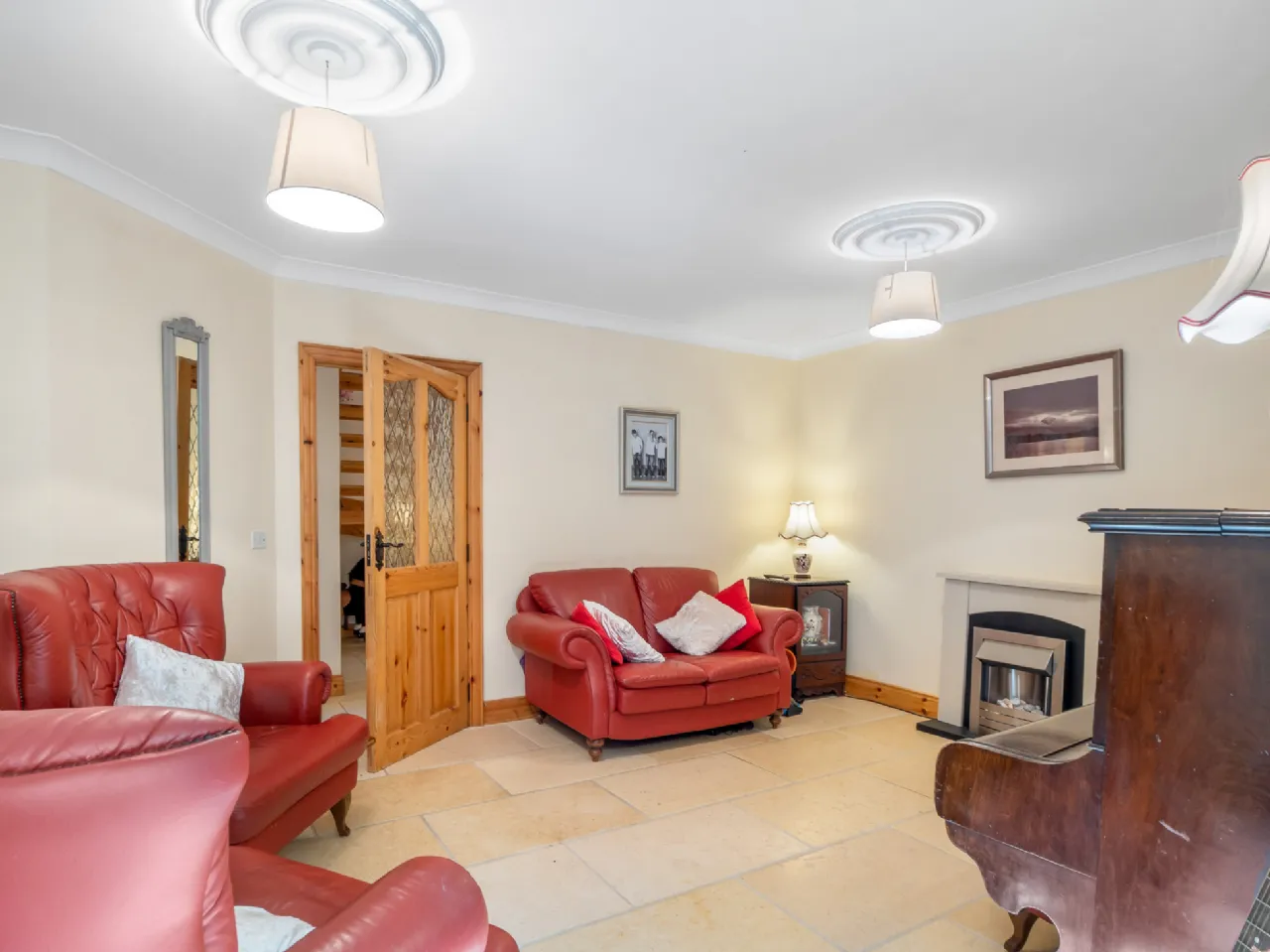 Sitting Room 4.8m x 3.7m Egyptian sandstone tiled floor, cornicing, electric fire, patio doors to side garden