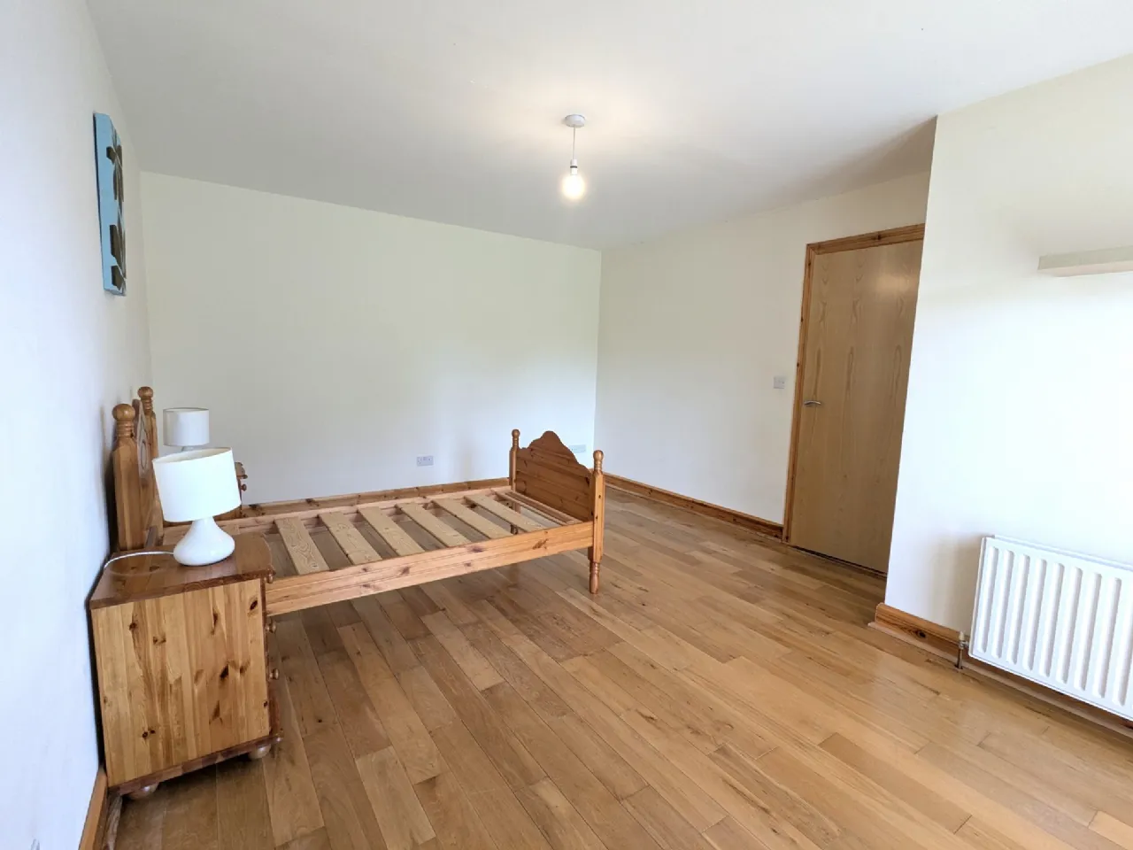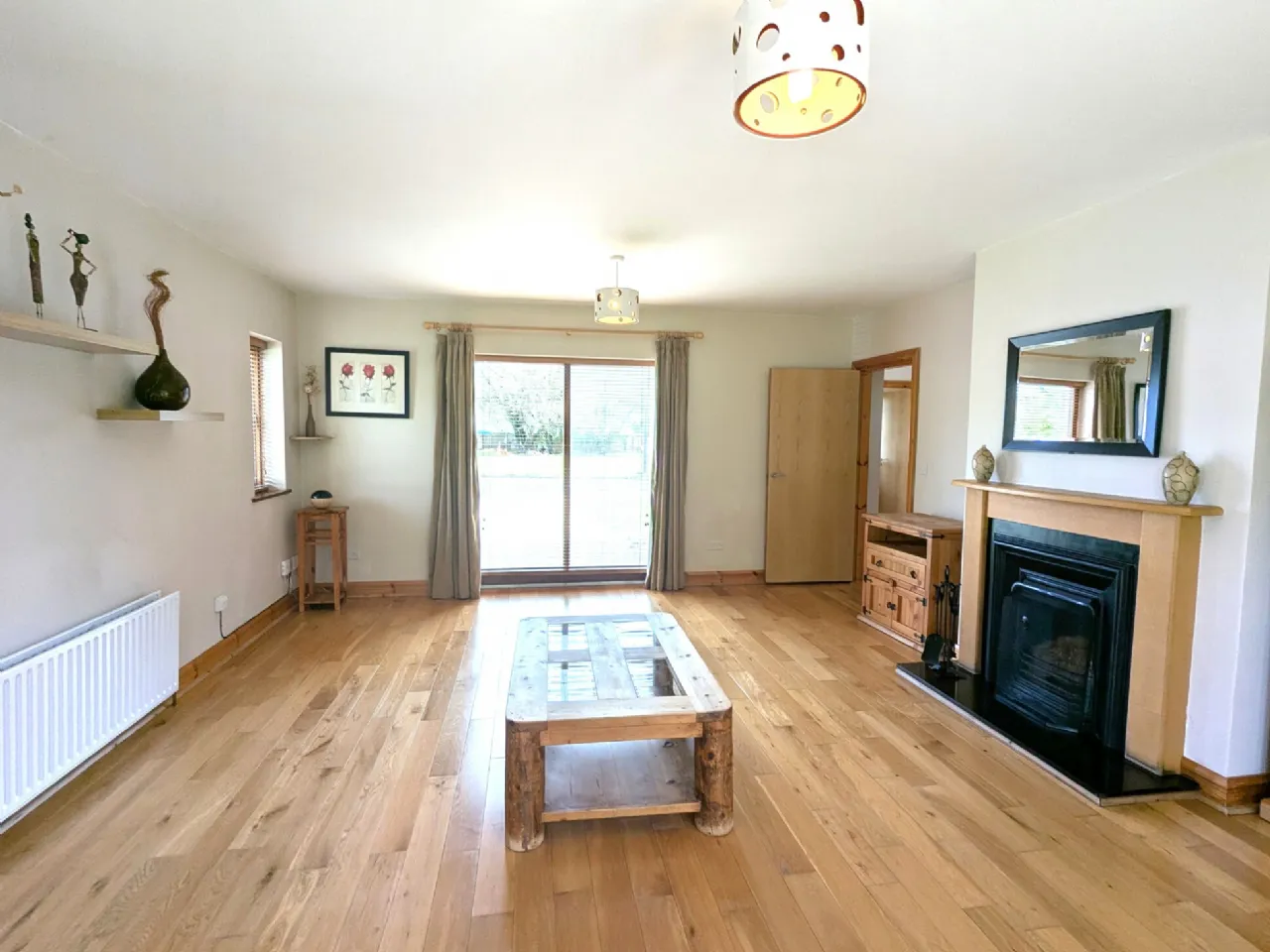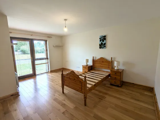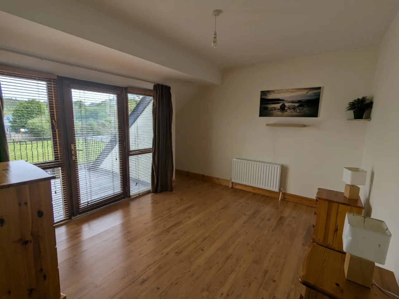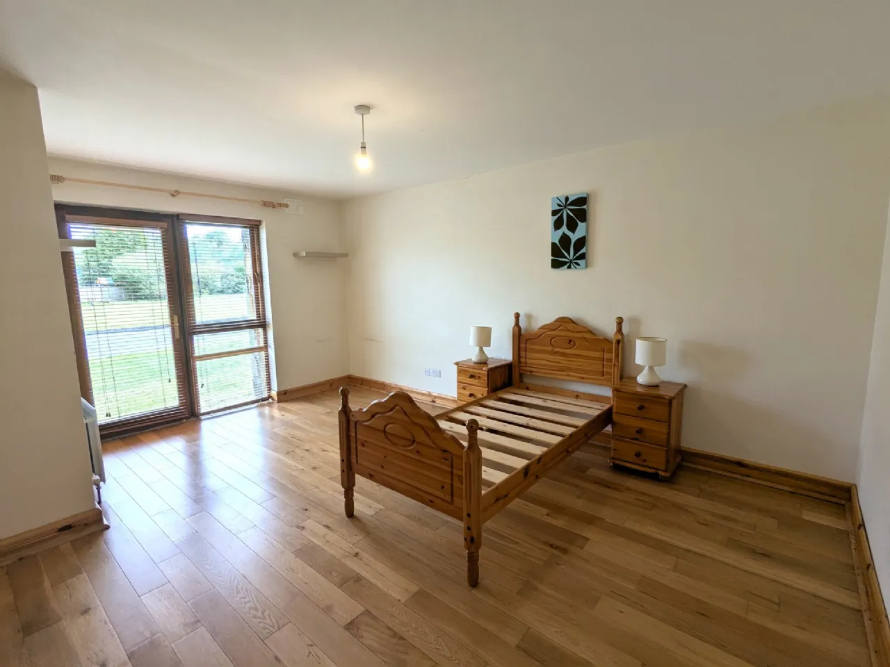 Bedroom One 5.0m x 3.78m Solid Asian oak floor, patio door to front garden, blinds