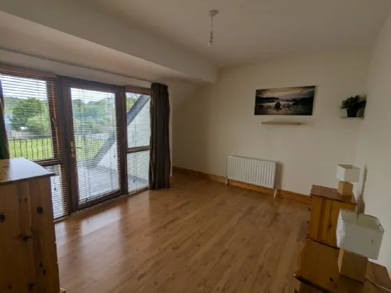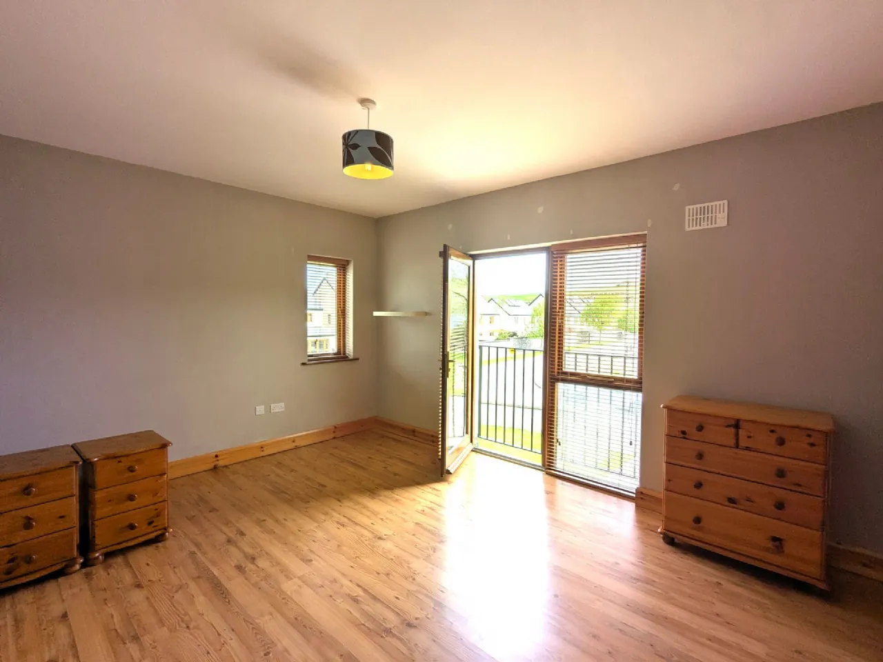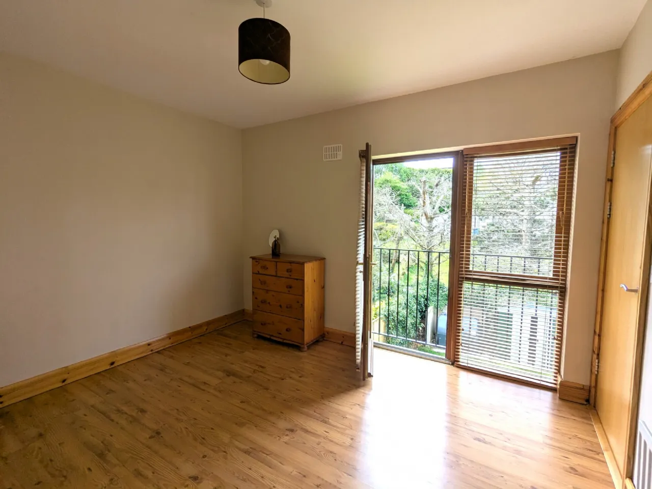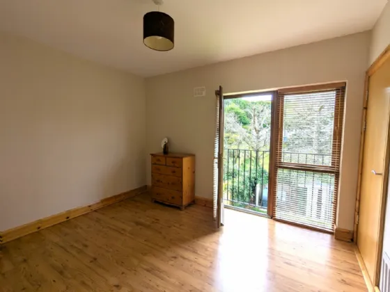 Bedroom Three 3.74m x 3.5m Pine laminate floor, Juliet balcony with patio door, blinds