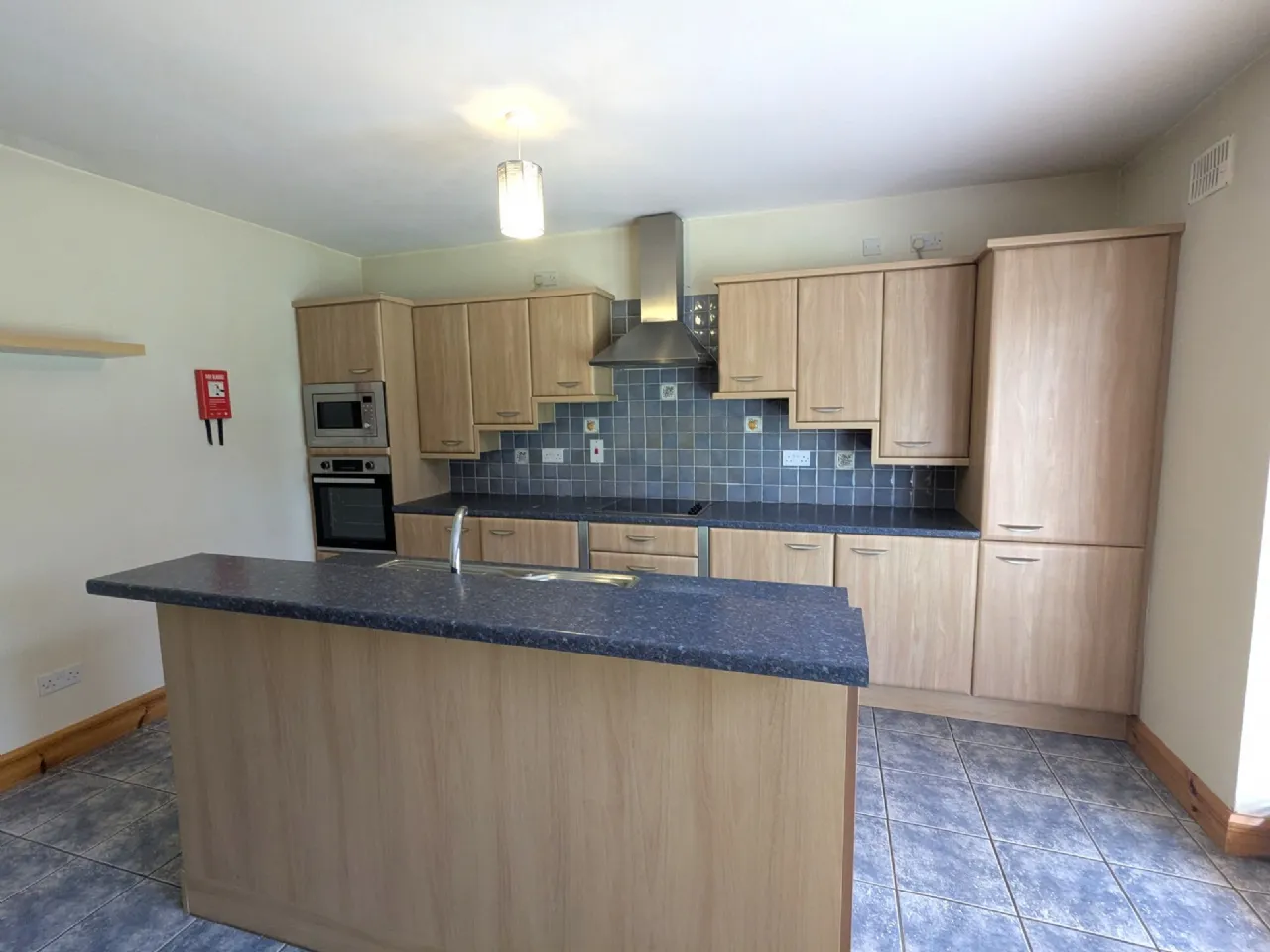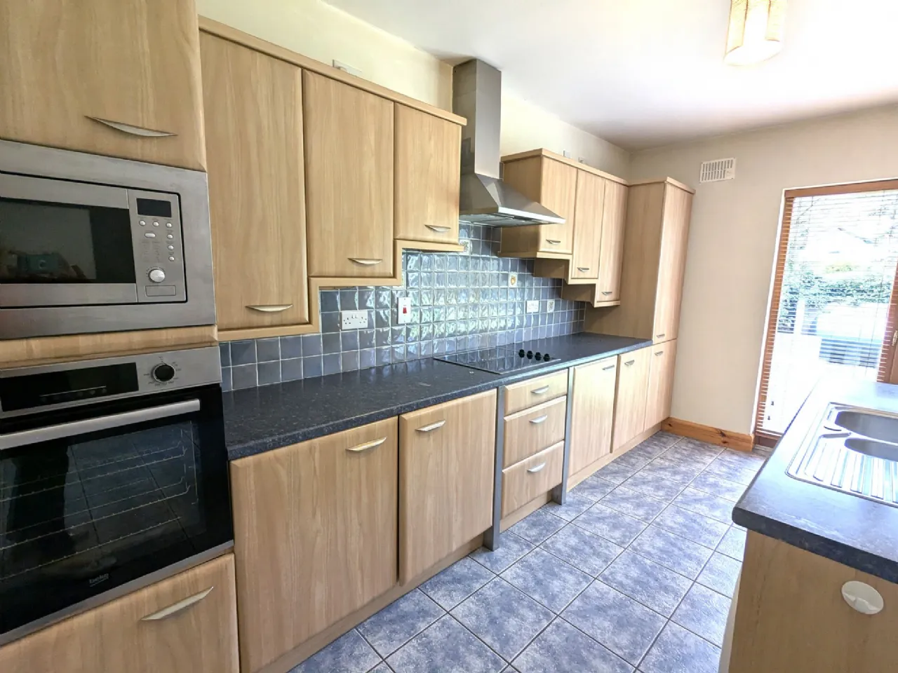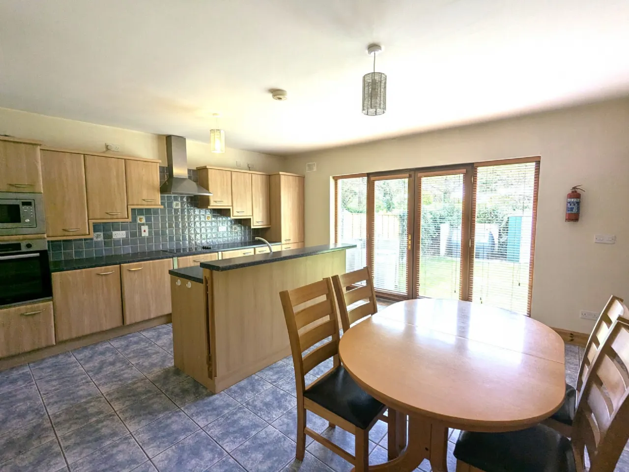 Kitchen/Dining 4.9m x 4.37m & 1.2m x 0.95m Tiled floor, beech slab kitchen with island unit, integrated oven, hob, microwave & fridge freezer, patio doors to back garden, blinds