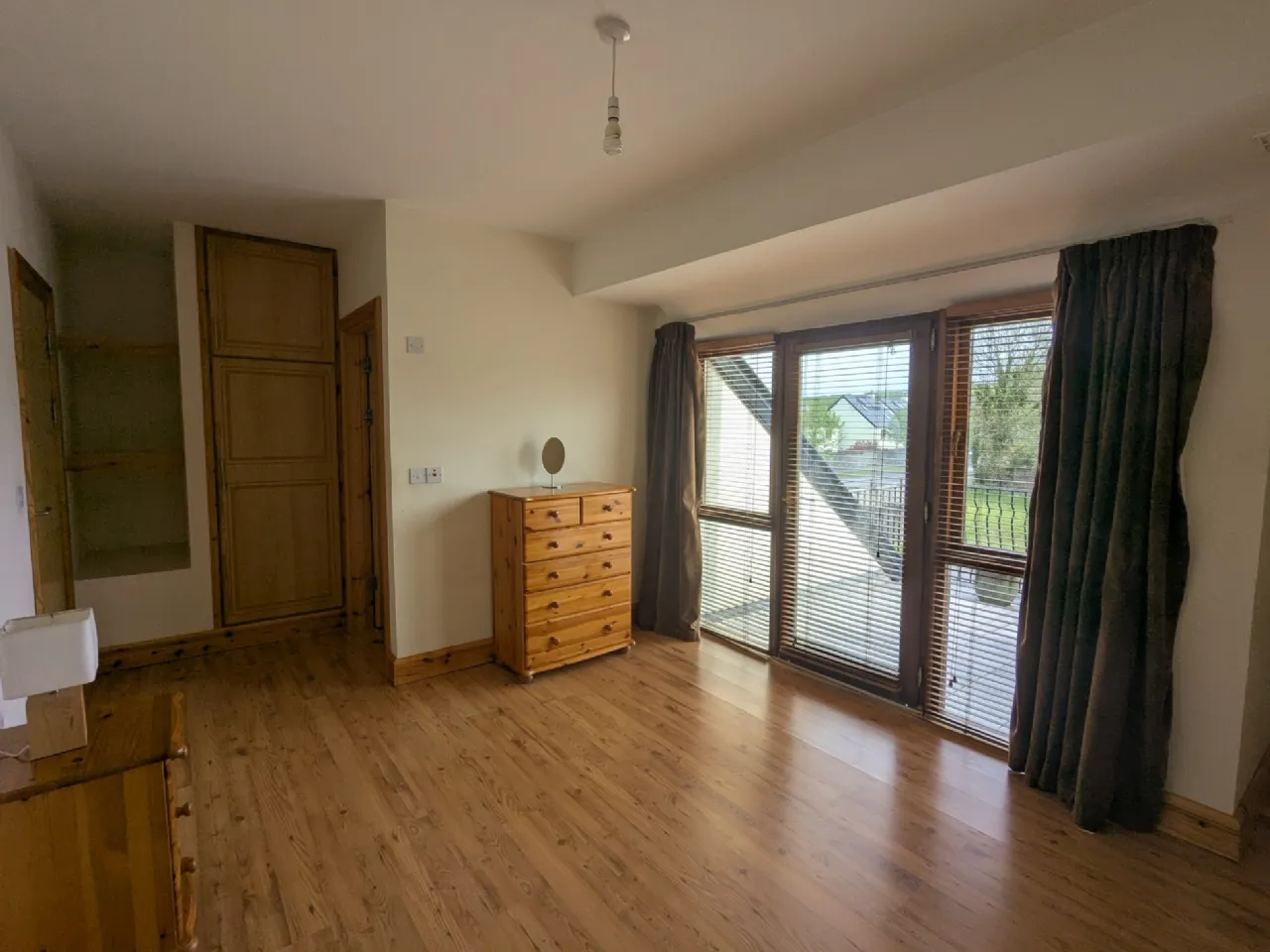 Bedroom Two 5.9m x 3.5m Pine laminate floor, doors to roof terrace, timber blinds, curtains (Measurement includes en-suite)